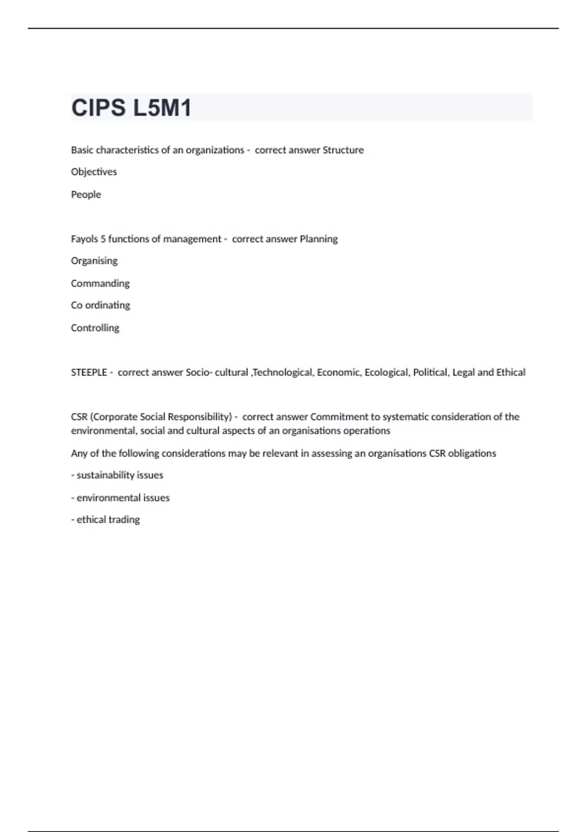 CIPS L5M1 Basic characteristics of an organizations - correct answer Structure Objectives People Fayols 5 functions of management - correct answer Planning Organising Commanding Co ordinating Controlling STEEPLE - correct answer Socio- cultural ,Technological, Economic, Ecological, Political, Legal and Ethical CSR (Corporate Social Responsibility) - correct answer Commitment to systematic consideration of the environmental, social and cultural aspects of an organisations operations Any of the following considerations may be relevant in assessing an organisations CSR obligations - sustainability issues - environmental issues - ethical trading