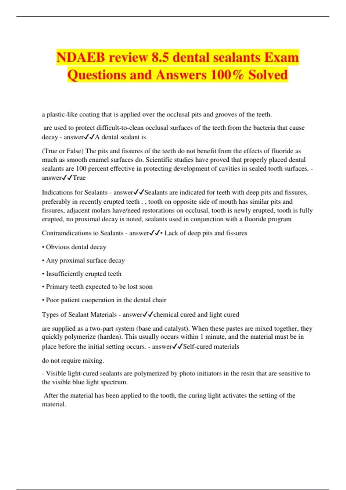 NDAEB review 8.5 dental sealants Exam Questions and Answers 100% Solved a plastic-like coating that is applied over the occlusal pits and grooves of the teeth. are used to protect difficult-to-clean occlusal surfaces of the teeth from the bacteria that cause decay - answerA dental sealant is (True or False) The pits and fissures of the teeth do not benefit from the effects of fluoride as much as smooth enamel surfaces do. Scientific studies have proved that properly placed dental sealants are 100 percent effective in protecting development of cavities in sealed tooth surfaces. - answerTrue Indications for Sealants - answerSealants are indicated for teeth with deep pits and fissures, preferably in recently erupted teeth . , tooth on opposite side of mouth has similar pits and fissures, adjacent molars have/need restorations on occlusal, tooth is newly erupted, tooth is fully erupted, no proximal decay is noted, sealants used in conjunction with a fluoride program Contraindications to Sealants - answer• Lack of deep pits and fissures • Obvious dental decay • Any proximal surface decay • Insufficiently erupted teeth • Primary teeth expected to be lost soon • Poor patient cooperation in the dental chair Types of Sealant Materials - answerchemical cured and light cured are supplied as a two-part system (base and catalyst). When these pastes are mixed together, they quickly polymerize (harden). This usually occurs within 1 minute, and the material must be in place before the initial setting occurs. - answerSelf-cured materials do not require mixing. - Visible light-cured sealants are polymerized by photo initiators in the resin that are sensitive to the visible blue light spectrum. After the material has been applied to the tooth, the curing light activates the setting of the material. A vast majority of sealants in use today are light-cured. - answerLight-cured sealants Advantages of self cured sealants - answer• No need for the curing light • No risk of damage to the retina from the curing