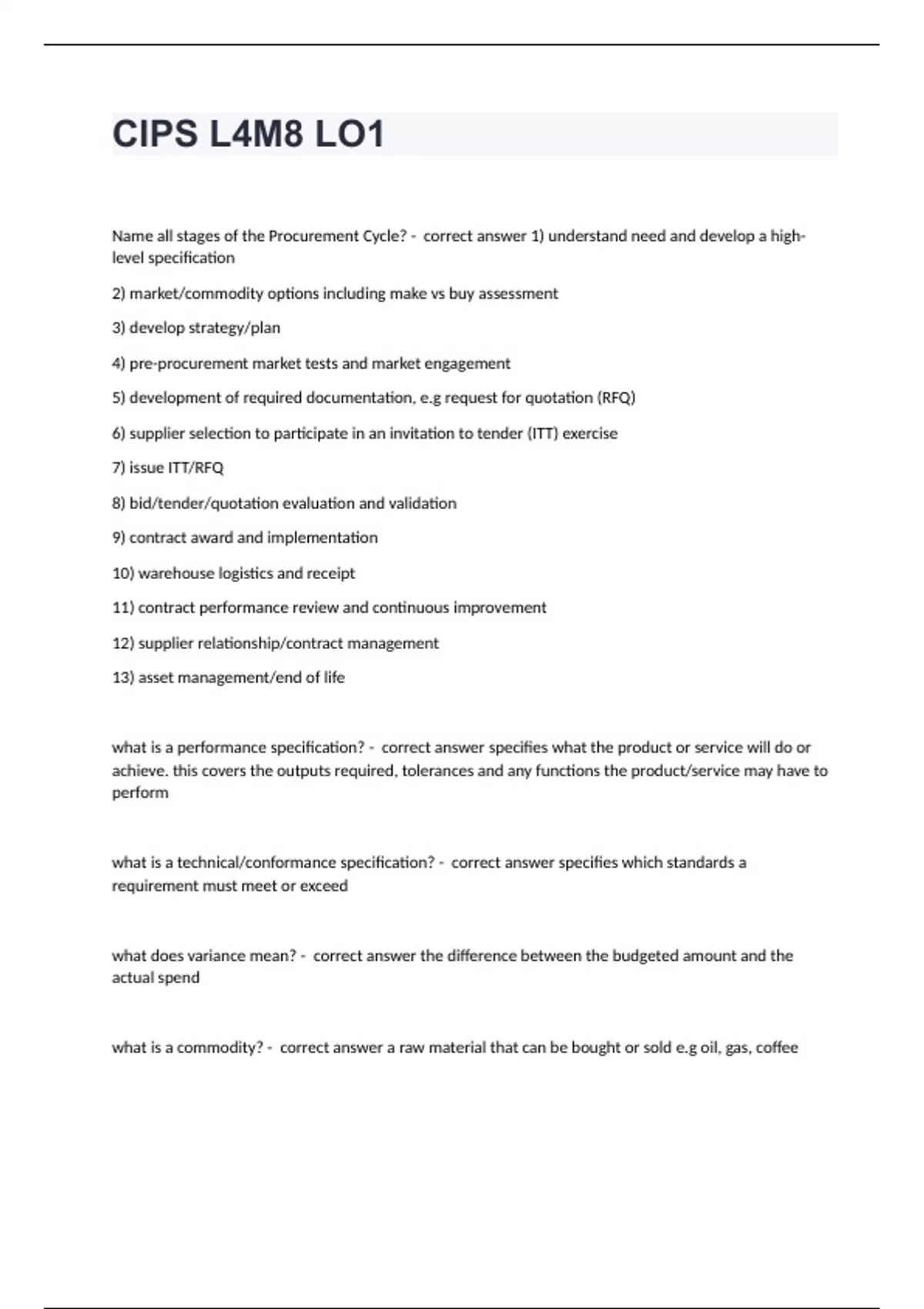 CIPS L4M8 LO1 Name all stages of the Procurement Cycle? - correct answer 1) understand need and develop a high-level specification 2) market/commodity options including make vs buy assessment 3) develop strategy/plan 4) pre-procurement market tests and market engagement 5) development of required documentation, e.g request for quotation (RFQ) 6) supplier selection to participate in an invitation to tender (ITT) exercise 7) issue ITT/RFQ 8) bid/tender/quotation evaluation and validation 9) contract award and implementation 10) warehouse logistics and receipt 11) contract performance review and continuous improvement 12) supplier relationship/contract management 13) asset management/end of life what is a performance specification? - correct answer specifies what the product or service will do or achieve. this covers the outputs required, tolerances and any functions the product/service may have to perform what is a technical/conformance specification? - correct answer specifies which standards a requirement must meet or exceed what does variance mean? - correct answer the difference between the budgeted amount and the actual spend what is a commodity? - correct answer a raw material that can be bought or sold e.g oil, gas, coffee What are Porter's Five Forces? - correct answer - rivalry among existing competitors - threat of new entrants - threat of substitutes - bargaining power of suppliers - bargaining power of buyers what are core competencies? - correct answer the processes that are critical to an organisation achieving success and competitive advantage What is outsourcing? - correct answer contracting an external company to supply goods or services that were once produced internally what are the benefits to outsourcing? - correct answer - saves money - reduces overheads - reduces headcount - using external knowledge - focusing internally on core competencies - helping with shortfalls in labour/expertise what are the disadvantages to outsourcing? - correct answer - losing some control within an organisation - relying on external organisations - reducing quality - losing some internal knowledge what is the STEEPLE analysis used for? - correct answer it is an effective way to evaluate the external environment. this helps buyers to assess which factors could affect their need and helps them to develop the plan accordingly what does STEEPLE stand for? - correct answer Social