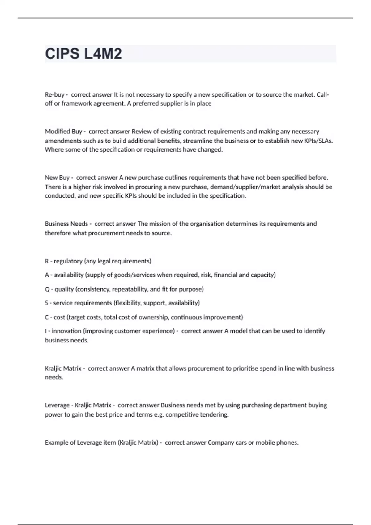 CIPS L4M2Re-buy - correct answer It is not necessary to specify a new specification or to source the market. Call-off or framework agreement. A preferred supplier is in place Modified Buy - correct answer Review of existing contract requirements and making any necessary amendments such as to build additional benefits, streamline the business or to establish new KPIs/SLAs. Where some of the specification or requirements have changed. New Buy - correct answer A new purchase outlines requirements that have not been specified before. There is a higher risk involved in procuring a new purchase, demand/supplier/market analysis should be conducted, and new specific KPIs should be included in the specification. Business Needs - correct answer The mission of the organisation determines its requirements and therefore what procurement needs to source. R - regulatory (any legal requirements) A - availability (supply of goods/services when required, risk, financial and capacity) Q - quality (consistency, repeatability, and fit for purpose) S - service requirements (flexibility, support, availability) C - cost (target costs, total cost of ownership, continuous improvement) I - innovation (improving customer experience) - correct answer A model that can be used to identify business needs. Kraljic Matrix - correct answer A matrix that allows procurement to prioritise spend in line with business needs. Leverage - Kraljic Matrix - correct answer Business needs met by using purchasing department buying power to gain the best price and terms e.g. competitive tendering. Example of Leverage item (Kraljic Matrix) - correct answer Company cars or mobile phones. Strategic - Kraljic Matrix - correct answer Business needs met by developing long term relationships such as partnerships to ensure security of supply. Example of Strategic item (Kraljic Matrix) - correct answer Capital assets such as premises Routine - Kraljic Matrix - correct answer Business needs met by trying to buy these more efficiently through blanket ordering, e-procurement and vendor managed inventory leadership in procurement and supply. Example of Routine item (Kraljic Matrix) - correct answer Stationary Bottleneck - Kraljic Matrix - correct answer Business needs met by developing appropriate contracts (such as call off contracts, framework agreements) in which the buyer can ensure that stock levels and maintained and speed of re-ordering. Example of Bottleneck item (Kraljic Matrix) - correct answer Spare parts or oil for machines Cost and risk - Kraljic Matric - correct answer Low cost / high risk - Bottleneck High cost / high risk - Strategic High cost / low risk - Leverage Low cost / low risk - Routine Total cost of ownership - correct answer Is how much it costs to own the product over its lifetime until disposal. Whole life costing - correct answer Is a technique used to arrive at the total cost of ownership Planning, preparation and implementation - correct answer Three stages of WLC