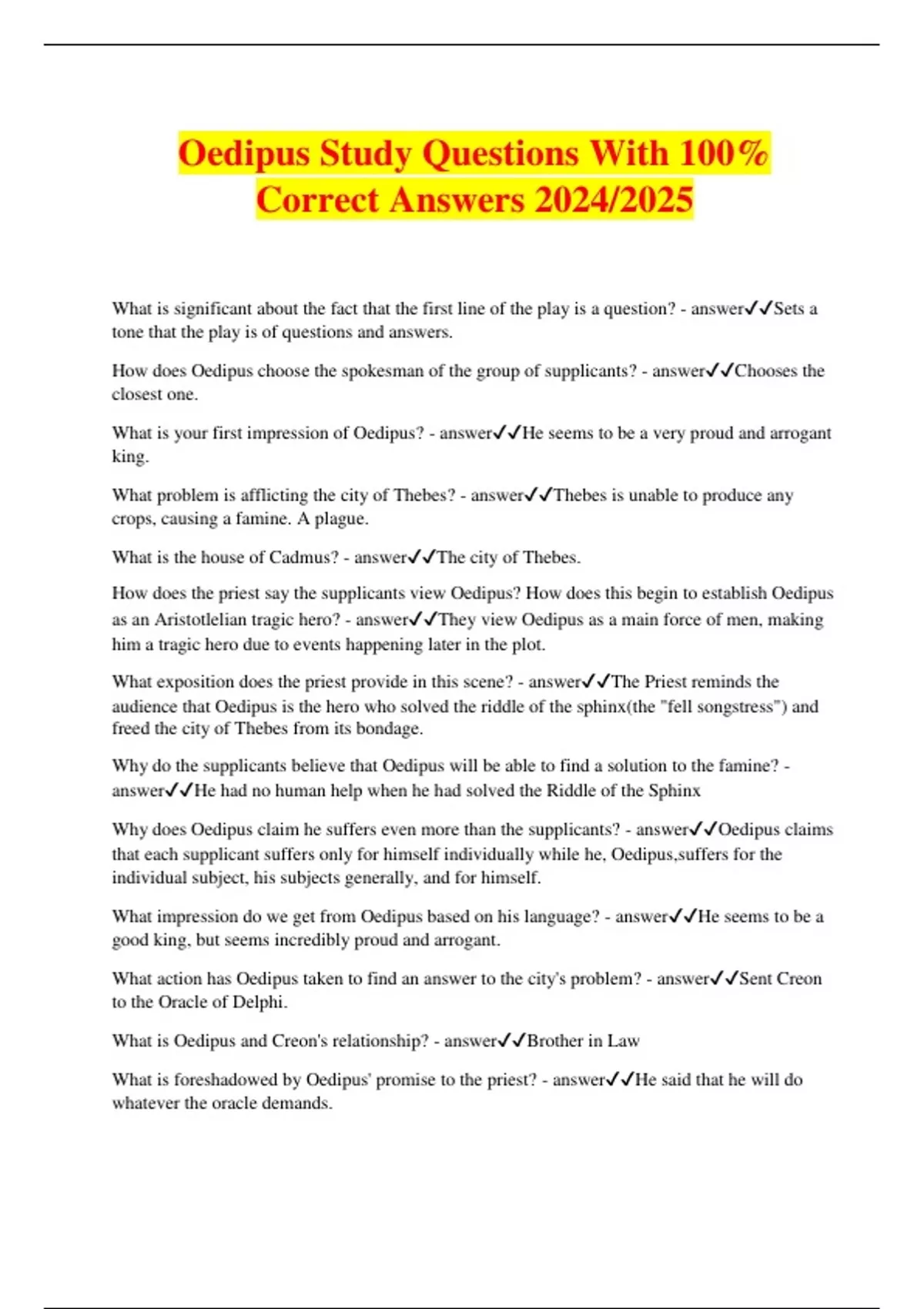Oedipus Study Questions With 100% Correct Answers 2024/2025
