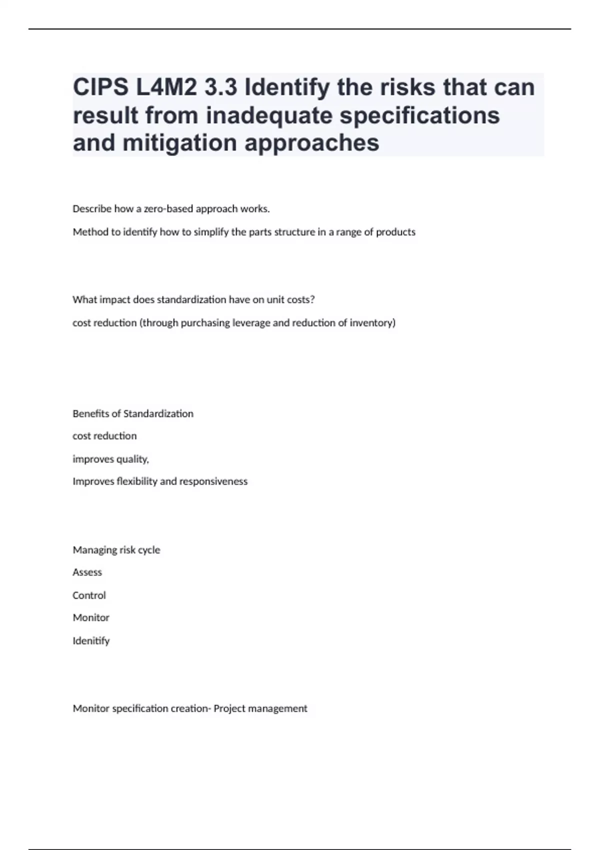 CIPS L4M2 3.3 Identify the risks that can result from inadequate specifications and mitigation approachesDescribe how a zero-based approach works. Method to identify how to simplify the parts structure in a range of products What impact does standardization have on unit costs? cost reduction (through purchasing leverage and reduction of inventory) Benefits of Standardization cost reduction improves quality, Improves flexibility and responsiveness Managing risk cycle Assess Control Monitor Idenitify Monitor specification creation- Project management Accountability Focus on goals Learning from experience Team morale Project Initiation Document Before specs writing project Scope Team mandate Metrics for managing projects Schedule variance Cost variance Stakeholder satisfaction Material requirements planning Production planning, scheduling, and inventory control system used to manage manufacturing processes LEAN METHOD: Types of wastes Defects Over-production Waiting Not using talent Transport & handling Inventory