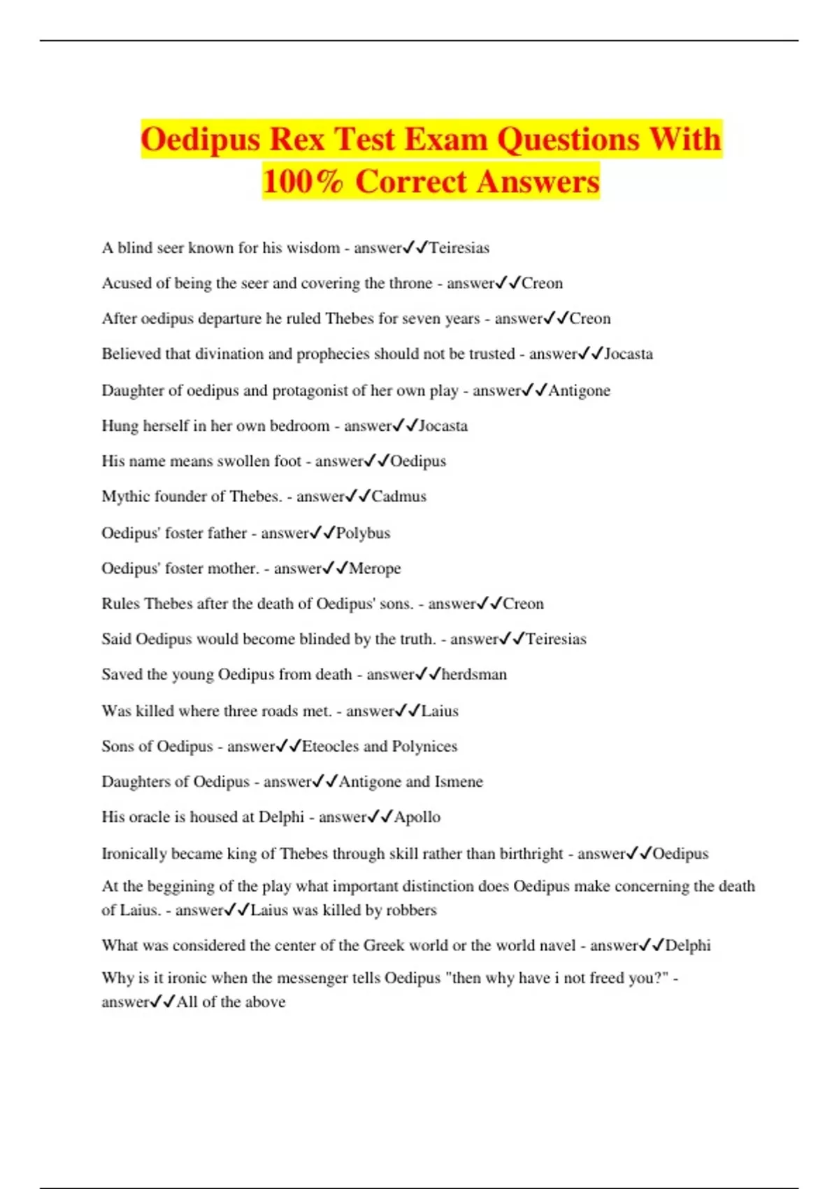 Oedipus Rex Test Exam Questions With 100% Correct Answers A blind seer known for his wisdom - answerTeiresias Acused of being the seer and covering the throne - answerCreon After oedipus departure he ruled Thebes for seven years - answerCreon Believed that divination and prophecies should not be trusted - answerJocasta Daughter of oedipus and protagonist of her own play - answerAntigone Hung herself in her own bedroom - answerJocasta His name means swollen foot - answerOedipus Mythic founder of Thebes. - answerCadmus Oedipus' foster father - answerPolybus Oedipus' foster mother. - answerMerope Rules Thebes after the death of Oedipus' sons. - answerCreon Said Oedipus would become blinded by the truth. - answerTeiresias