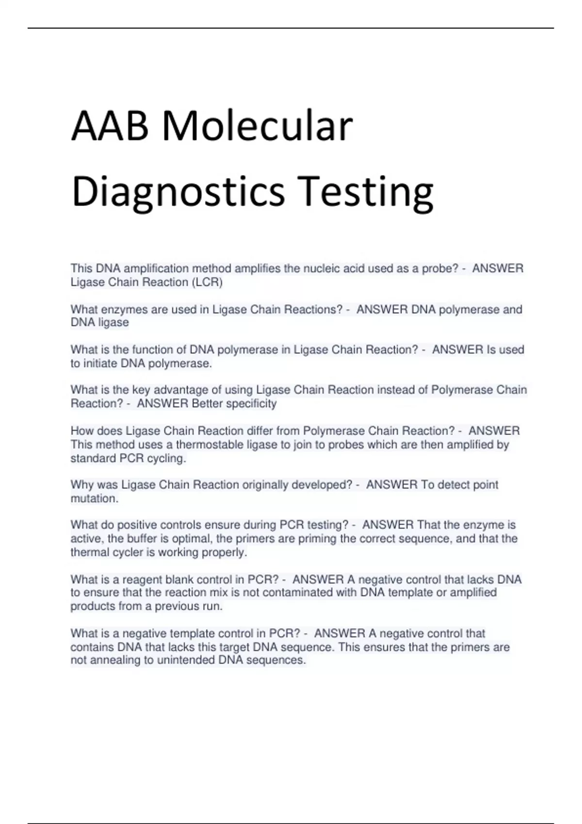 AAB Molecular Diagnostics Testing This DNA amplification method amplifies the nucleic acid used as a probe? - ANSWER Ligase Chain Reaction (LCR) What enzymes are used in Ligase Chain Reactions? - ANSWER DNA polymerase and DNA ligase What is the function of DNA polymerase in Ligase Chain Reaction? - ANSWER Is used to initiate DNA polymerase. What is the key advantage of using Ligase Chain Reaction instead of Polymerase Chain Reaction? - ANSWER Better specificity
