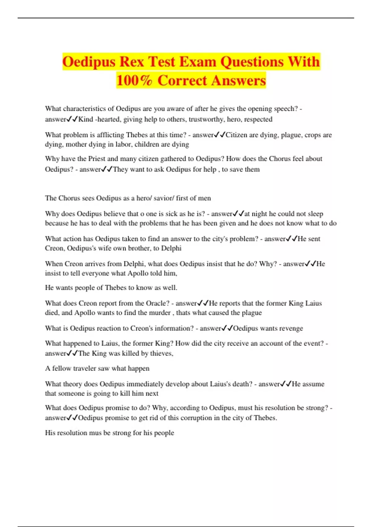 Oedipus Rex Test Exam Questions With 100% Correct Answers What characteristics of Oedipus are you aware of after he gives the opening speech? - answerKind -hearted, giving help to others, trustworthy, hero, respected What problem is afflicting Thebes at this time? - answerCitizen are dying, plague, crops are dying, mother dying in labor, children are dying Why have the Priest and many citizen gathered to Oedipus? How does the Chorus feel about Oedipus? - answerThey want to ask Oedipus for help , to save them The Chorus sees Oedipus as a hero/ savior/ first of men Why does Oedipus believe that o one is sick as he is? - answerat night he could not sleep because he has to deal with the problems that he has been given and he does not know what to do What action has Oedipus taken to find an answer to the city's problem? - answerHe sent Creon, Oedipus's wife own brother, to Delphi When Creon arrives from Delphi, what does Oedipus insist that he do? Why? - answerHe insist to tell everyone what Apollo told him, He wants people of Thebes to know as well. What does Creon report from the Oracle? - answerHe reports that the former King Laius died, and Apollo wants to find the murder , thats what caused the plague What is Oedipus reaction to Creon's information? - answerOedipus wants revenge What happened to Laius, the former King? How did the city receive an account of the event? - answerThe King was killed by thieves, A fellow traveler saw what happen What theory does Oedipus immediately develop about Laius's death? - answerHe assume that someone is going to kill him next What does Oedipus promise to do? Why, according to Oedipus, must his resolution be strong? - answerOedipus promise to get rid of this corruption in the city of Thebes. His resolution mus be strong for his people