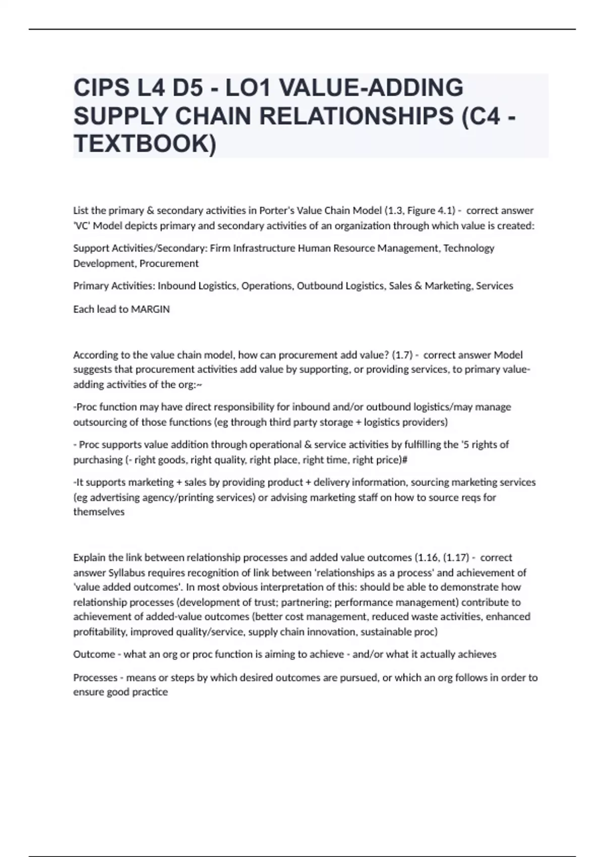 CIPS L4 D5 - LO1 VALUE-ADDING SUPPLY CHAIN RELATIONSHIPS (C4 - TEXTBOOK) questions and answers graded A+ 2024.2025