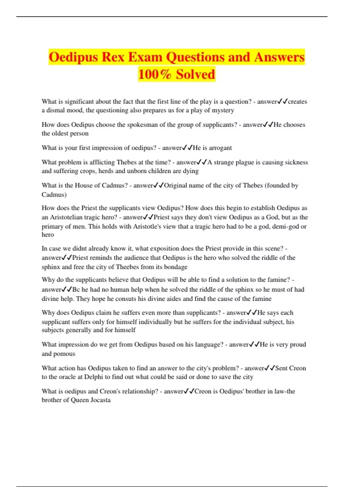 Oedipus Rex Exam Questions and Answers 100% Solved What is significant about the fact that the first line of the play is a question? - answercreates a dismal mood, the questioning also prepares us for a play of mystery How does Oedipus choose the spokesman of the group of supplicants? - answerHe chooses the oldest person What is your first impression of oedipus? - answerHe is arrogant What problem is afflicting Thebes at the time? - answerA strange plague is causing sickness and suffering crops, herds and unborn children are dying What is the House of Cadmus? - answerOriginal name of the city of Thebes (founded by Cadmus) How does the Priest the supplicants view Oedipus? How does this begin to establish Oedipus as an Aristotelian tragic hero? - answerPriest says they don't view Oedipus as a God, but as the primary of men. This holds with Aristotle's view that a tragic hero had to be a god, demi-god or hero In case we didnt already know it, what exposition does the Priest provide in this scene? - answerPriest reminds the audience that Oedipus is the hero who solved the riddle of the sphinx and free the city of Theebes from its bondage Why do the supplicants believe that Oedipus will be able to find a solution to the famine? - answerBc he had no human help when he solved the riddle of the sphinx so he must of had divine help. They hope he consuts his divine aides and find the cause of the famine Why does Oedipus claim he suffers even more than supplicants? - answerHe says each supplicant suffers only for himself individually but he suffers for the individual subject, his subjects generally and for himself What impression do we get from Oedipus based on his language? - answerHe is very proud and pomous What action has Oedipus taken to find an answer to the city's problem? - answerSent Creon to the oracle at Delphi to find out what could be said or done to save the city What is oedipus and Creon's relationship? - answerCreon is Oedipus' brother in law-the brother of Queen Jocasta What is foreshadowed by Oedipus' promise to the Priest? - answerOedipus promises he will do whatever the oracle commands. This foreshadows he probably will be commanded to do extremely unpleasant of even impossible task to end the famine Why does the Priest suspect Creon brings good news? - answerBc he is wearing a crown made from a Laurel, the tree of Apollo, and believes he would not do so if he brought bad news When Creon arrives from Delphi what does Oedipus insist that he do? What does this indicate about his character? - answerCreon wants to speak in private about the Oracle but Oedipus insists everyone should hear. It shows he loves his subjects but also a thoughtless, impetuous streak Why do you suppose creon wants to talk in oedipus in private? - answerCreon knows that his sister Jocasta's son was destined to murder his father. The Father (Lauis) has been murdered and he probably wants to protect his family What does Creon report from the Oracle? - answerThe murderer of Lauis has not been found. He is in Thebes and is the direct cause of the plague.The killer must be exiled or murdered to end the plague What is Oedipus' reaction to Creon's information? - answerHe asks questions about Lauis' murder to find more info about it to help find the murderer and purge the city Explain the dramatic irony in Oedipus' interrogation of Creon - answerThe audience knows the story, that Oedipus is Lauis' killer What is ironic about the one survivor's testimony? - answerThe one survivor has lied all these years, claiming that Lauis was beset by robbers? What theory does Oedipus immediately develop about Lauis' death? - answerThat the murderer was part of a plot assassinate the king Why did the citizens of Thebes not investiage Lauis' murder at the time it occurred? - answerThey were to preoccupied with the Sphinx which was tormenting the city What does Oedipus promise to do? Why, according to OEdipus, must his resolution be strong? - answerTo avenge the murder of Lauis. He believes it is his duty as king to save his people and the murderer might even hurt him Why does the Chorus appear at this point in the play? - answerThe conflict has been introduced and the plot set in motion. Now is an appropriate time to pause, reflect and evaluate What voices does the Chorus represent? - answerThe voice of the Theban commoners, praying for relief from their family