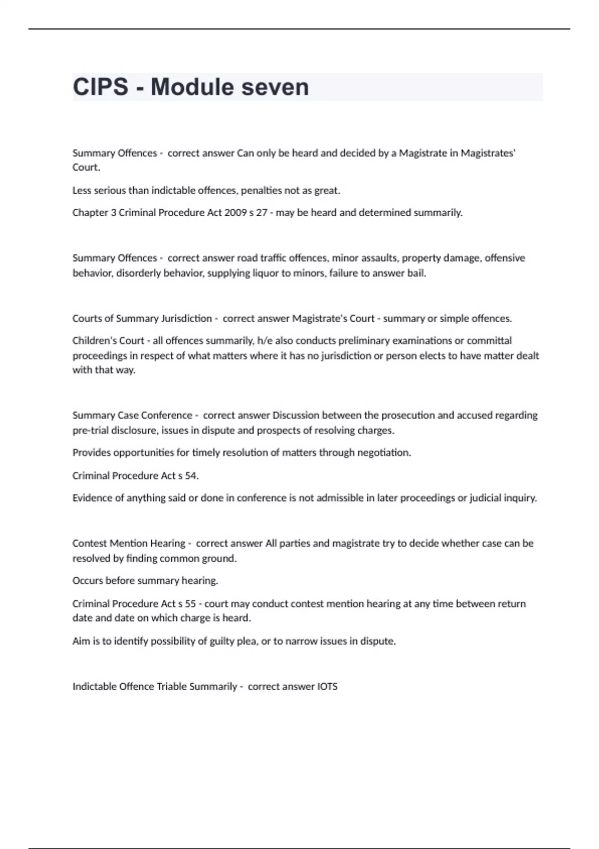 CIPS - Module sevenSummary Offences - correct answer Can only be heard and decided by a Magistrate in Magistrates' Court. Less serious than indictable offences, penalties not as great. Chapter 3 Criminal Procedure Act 2009 s 27 - may be heard and determined summarily. Summary Offences - correct answer road traffic offences, minor assaults, property damage, offensive behavior, disorderly behavior, supplying liquor to minors, failure to answer bail. Courts of Summary Jurisdiction - correct answer Magistrate's Court - summary or simple offences. Children's Court - all offences summarily, h/e also conducts preliminary examinations or committal proceedings in respect of what matters where it has no jurisdiction or person elects to have matter dealt with that way. Summary Case Conference - correct answer Discussion between the prosecution and accused regarding pre-trial disclosure, issues in dispute and prospects of resolving charges. Provides opportunities for timely resolution of matters through negotiation. Criminal Procedure Act s 54. Evidence of anything said or done in conference is not admissible in later proceedings or judicial inquiry. Contest Mention Hearing - correct answer All parties and magistrate try to decide whether case can be resolved by finding common ground. Occurs before summary hearing. Criminal Procedure Act s 55 - court may conduct contest mention hearing at any time between return date and date on which charge is heard. Aim is to identify possibility of guilty plea, or to narrow issues in dispute. Indictable Offence Triable Summarily - correct answer IOTS Max terms imposed in Magistrates' court are two years for single offence or five years for multiple offences, or 500 penalty units. What are IOTS? - correct answer Level 5 or 6 offences. Punishable by level 5 or 6 imprisonment, fine or both. Punishable by term of imprisonment not more than 10 years, a fine of not more than 1200 penalty units or both. Listed in CPA Schedule 2. Criteria to Consider - correct answer Court must consider it appropriate and accused must consent. Court must consider seriousness of offence, adequacy of sentences available, if co-accused charged with same offence, any other relevant matters. Objecting to Summary hearing - correct answer Crim Procedure Act s 29(2) - If court does not consider it appropriate, matter will proceed as committal hearing. DPP v Cowling (1994) - Opinion that summary hearing is not appropriate is not formed lightly. Hansford v Judge Neeesham (Unreported) VSC, 31 August 1994; Hall v Braybrook (1956) - no general power to obtain additional info about previous convictions before deciding to grant application for summary hearing. Procedure - correct answer Crim Procedure Act ss 6, 29; Children, youth and families act 2005 s 356 - application by informant or accused or offered by court. Consent - correct answer Crim Procedure Act ss 29-30 - accused must consent. Crim Procedure act s 62 - not essential for accused to be represented. Children's Court - correct answer Children, youth and families act s 344 - aged under 10 years presumed incapable of committing offences. s 516 - indictable offences except murder, attempted murder, manslaughter, child homicide, defensive homicide, arson causing death and culpable driving causing death may be heard summarily in children's court. Committal Hearing - correct answer Magistrates' Court. Magistrate will decide if there is enough evidence to send accused to County or Supreme Court for trial