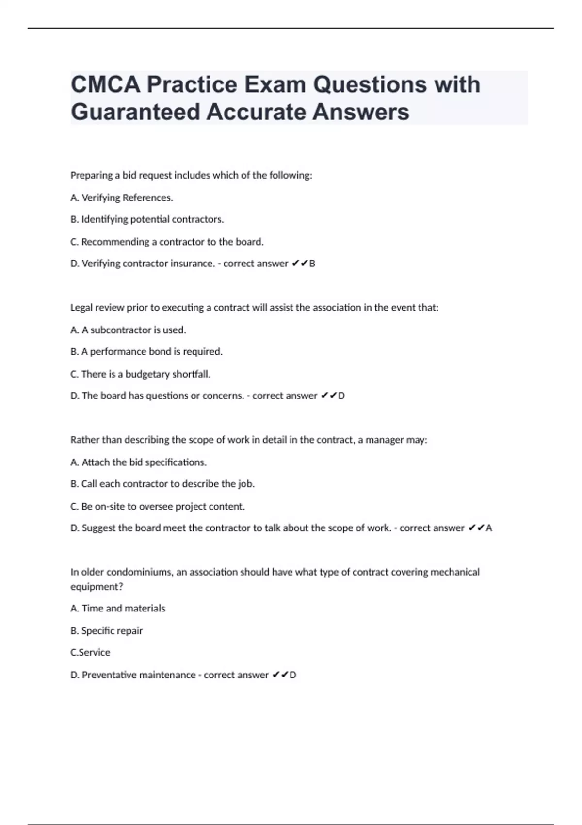 Preparing a bid request includes which of the following: A. Verifying References. B. Identifying potential contractors. C. Recommending a contractor to the board. D. Verifying contractor insurance. - correct answer B Legal review prior to executing a contract will assist the association in the event that: A. A subcontractor is used. B. A performance bond is required. C. There is a budgetary shortfall. D. The board has questions or concerns. - correct answer D Rather than describing the scope of work in detail in the contract, a manager may: A. Attach the bid specifications. B. Call each contractor to describe the job. C. Be on-site to oversee project content. D. Suggest the board meet the contractor to talk about the scope of work. - correct answer A In older condominiums, an association should have what type of contract covering mechanical equipment? A. Time and materials B. Specific repair C.Service D. Preven
