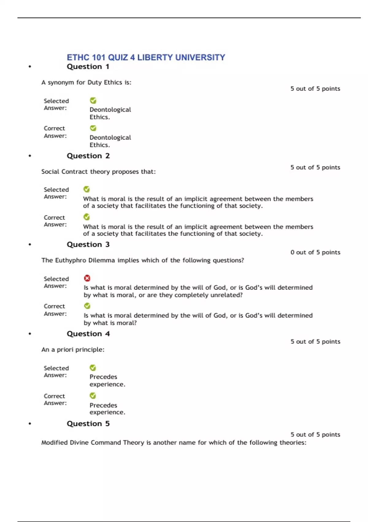 ETHC 101 QUIZ 4 LIBERTY UNIVERSITY • Question 1 A synonym for Duty Ethics is: Selected Answer: Deontological Ethics. 5 out of 5 points Correct Answer: Deontological Ethics. • Question 2 Social Contract theory proposes that: 5 out of 5 points Selected Answer: What is moral is the result of an implicit agreement between the members of a society that facilitates the functioning of that society. Correct Answer: What is moral is the result of an implicit agreement between the members of a society that facilitates the functioning of that society. • Question 3 0 out of 5 points The Euthyphro Dilemma implies which of the following questions? Selected Answer: Is what is moral determined by the will of God, or is God’s will determined by what is moral, or are they completely unrelated? Correct Answer: Is what is moral determined by the will of God, or is God’s will determined by what is moral? • Question 4 An a priori principle: Selected Answer: Precedes experience. 5 out of 5 points Correct Answer: Precedes experience. • Question 5 5 out of 5 points Modified Divine Command Theory is another name for which of the following theories: