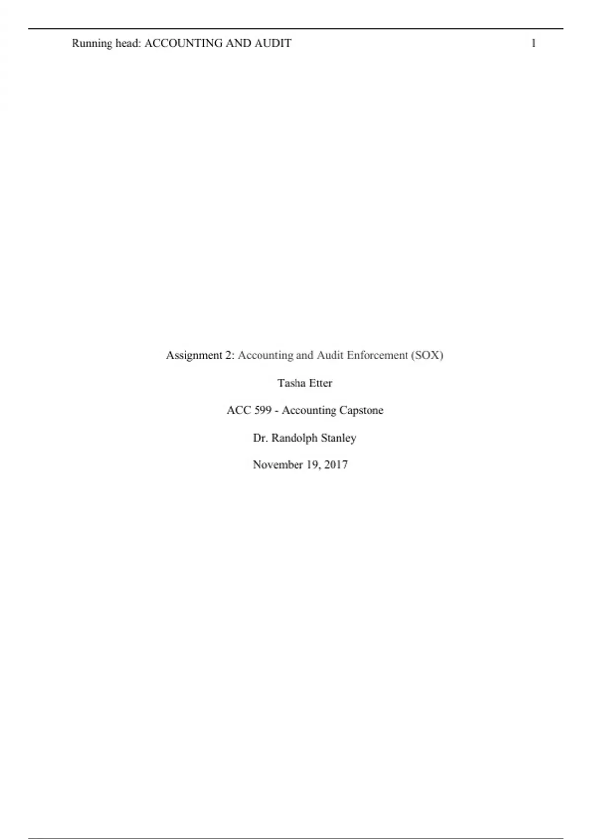 Assignment 2: Accounting and Audit Enforcement (SOX) Tasha Etter ACC 599 - Accounting Capstone Dr. Randolph Stanley November 19, 2017 SOX Regulations and Audit Enforcement Introduction As we acknowledge the fifteenth (15th) year anniversary of the establishment and implementation of the Sarbanes-Oxley Act (SOX), which officially took effect in the summer of 2002, it requires an analysis of its true effectiveness on publically traded companies, and the implications it may have for non-profit organizations now and in the near future within the healthcare industry. A specific focus will be on the underlying effects SOX has had on for-profit organizations while purporting if such regulations can be beneficial to non-profit organizations in the future, with the continued goal of providing a benchmark from which all business can operate from with fraud prevention in mind. It will also take a look at a healthcare organization that has been charged with improprieties regarding financial fraud and identify whether mandating SOX for both profit and non-profit organizations will be beneficial in the future. Additional, this assignment will explore allegations made against Tenet Healthcare Corporation in 2013, for engaging in fraudulent activity in the form of bribery and kickbacks that were offered to smaller clinics in the state of Georgia for unwarranted patient referrals. Members of the organization did so to gain reimbursements from Medicaid, and Medicare governmental programs for referrals and services offered unnecessarily (Dept. of Justice, Oct.3, 2016). Publically traded organizations, regardless of industry, must adhere to SOX regulations to avoidpenalties, be it financial or otherwise, issued by the SEC or other government agencies. Provisions of the Sarbanes-Oxley Act (SOX) apply to for-profit businesses by offering corporate governance and financial best practice guidelines as a result of significant misconduct that occurred within companies such as Enron, World Com, Tenet Healthcare Corporation, and Allegheny Health, Education and Research Foundation (AHERF). The later, AHERF, filed bankruptcy and was considered one of the largest recorded, of a healthcare organization in the United States (Loubeau and Griffith, 2012, p39). While there is a litany of regulations that exist, the ones under SOX that appear to most concerning in a for-profit healthcare organization include the need for there to be: (1) public accountability, in which the organization identifies the importance of corporate governance to protect the interest of shareholders and communities served; (2) a transparency policy that requires organizations to be transparent when disclosing their financial statements and position; (3) a board quality committee known as the audit committee which is formulated with existing board members who are required to oversee the integrity of the organization's finances, (4) independence and quality expertise on the audit committee and typically includes at least one member who is termed a financial expert and can understand the financial information being presented to the audit committee and by the external auditor; (5) active engagement, which means that the audit committee is involved in terms of educating (other members), questioning, and discussing the information received from management; and (6) Independent audit quality which is achieved by retaining an external auditor who works directly with the audit committee and provides annual reports on the organization's financial position, accounting practices, and identifies any issues (mis-statements) pertaining to