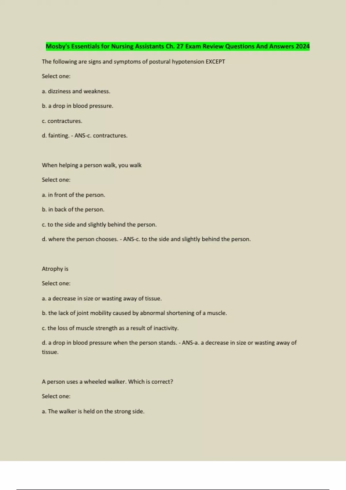 Mosby's Essentials for Nursing Assistants Ch. 27 Exam Review Questions And Answers 2024 The following are signs and symptoms of postural hypotension EXCEPT Select one: a. dizziness and weakness. b. a drop in blood pressure. c. contractures. d. fainting. - ANS-c. contractures. When helping a person walk, you walk Select one: a. in front of the person. b. in back of the person. c. to the side and slightly behind the person. d. where the person chooses. - ANS-c. to the side and slightly behind the person. Atrophy is Select one: a. a decrease in size or wasting away of tissue. b. the lack of joint mobility caused by abnormal shortening of a muscle. c. the loss of muscle strength as a result of inactivity. d. a drop in blood pressure when the person stands. - ANS-a. a decrease in size or wasting away of tissue. A person uses a wheeled walker. Which is correct? Select one: a. The walker is held on the strong side. CONTINUES...