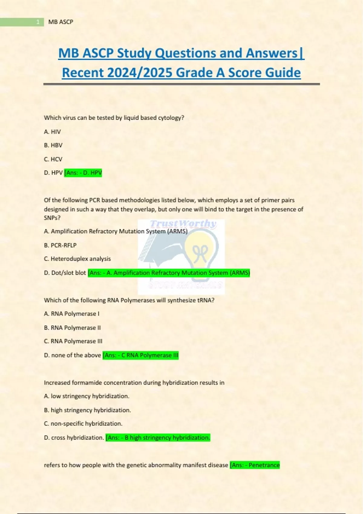 MB ASCP Study Questions and Answers| Recent 2024/2025 Grade A Score Guide,MB ASCP Study Questions and Answers| Recent 2024/2025 Grade A Score Guide,MB ASCP Study Questions and Answers| Recent 2024/2025 Grade A Score Guide