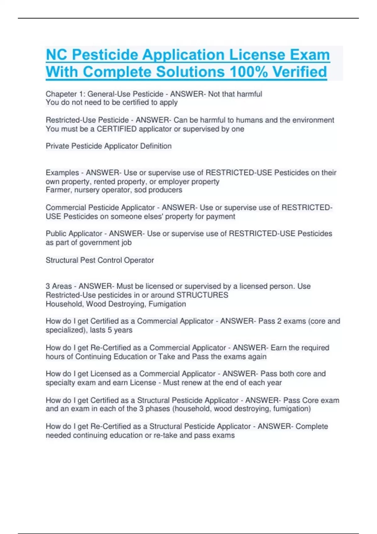 NC Pesticide Application License Exam With Complete Solutions 100% Verified Chapeter 1: General-Use Pesticide - ANSWER- Not that harmful You do not need to be certified to apply Restricted-Use Pesticide - ANSWER- Can be harmful to humans and the environment You must be a CERTIFIED applicator or supervised by one Private Pesticide Applicator Definition Examples - ANSWER- Use or supervise use of RESTRICTED-USE Pesticides on their own property, rented property, or employer property Farmer, nursery operator, sod producers Commercial Pesticide Applicator - ANSWER- Use or supervise use of RESTRICTED-USE Pesticides on someone elses' property for payment Public Applicator - ANSWER- Use or supervise use of RESTRICTED-USE Pesticides as part of government job Structural Pest Control Operator 3 Areas - ANSWER- Must be licensed or supervised by a licensed person. Use Restricted-Use pesticides in or around STRUCTURES Household, Wood Destroying, Fumigation How do I get Certified as a Commercial Applicator - ANSWER- Pass 2 exams (core and specialized), lasts 5 years How do I get Re-Certified as a Commercial Applicator - ANSWER- Earn the required hours of Continuing Education or Take and Pass the exams again How do I get Licensed as a Commercial Applicator - ANSWER- Pass both core and specialty exam and earn License - Must renew at the end of each year How do I get Certified as a Structural Pesticide Applicator - ANSWER- Pass Core exam and an exam in each of the 3 phases (household, wood destroying, fumigation) How do I get Re-Certified as a Structural Pesticide Applicator - ANSWER- Complete needed continuing education or re-take and pass exams How do I get Licensed as a Structural Pesticide Applicator - ANSWER- Be certified in the area, have 2 year's of experience How long does a Structural Pest Control License last? - ANSWER- 5 years What are the Categories of Licensing for Certification as a Commercial Applicator - ANSWER- Registered Technician Non-Commercial Certified Applicator Commercial Certified Applicator License Can Structural Pest Control Applicators Work for Hire on their own? - ANSWER- They have to work for a licensed pest control company Chapter 2: Federal Insecticide, Fungicide, and Rodenticide (FIFRA) Act - ANSWER- Ruled by the Environmental Protection Agency (EPA) Register products based on possible effects to people and the environment What is important about a Pesticide Label - ANSWER- People who don't follow it are BREAKING THE LAW What does the EPA do? - ANSWER- Re-evaluate older pesticides Review every pesticide on a 15 year cycle Establish safety rules for workers What can STATES do to regulate pesticides? - ANSWER- They must follow EPA guidelines at a minimum They can make even harder guidelines Is there a special ACT that relates to food and feed products? - ANSWER- Federal Food, Drug, and Cosmetic Act established tolerance levels for food - how much residue of a pesticide is allowed