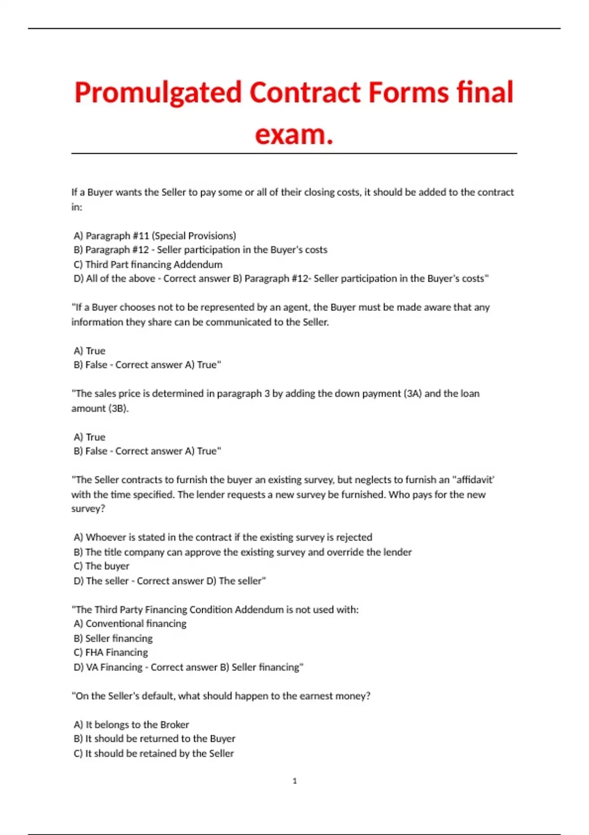 Promulgated Contract Forms final exam. If a Buyer wants the Seller to pay some or all of their closing costs, it should be added to the contract in: A) Paragraph #11 (Special Provisions) B) Paragraph #12 - Seller participation in the Buyer's costs C) Third Part financing Addendum D) All of the above - Correct answer B) Paragraph #12- Seller participation in the Buyer's costs" "If a Buyer chooses not to be represented by an agent, the Buyer must be made aware that any information they share can be communicated to the Seller. A) True B) False - Correct answer A) True" "The sales price is determined in paragraph 3 by adding the down payment (3A) and the loan amount (3B). A) True B) False - Correct answer A) True" "The Seller contracts to furnish the buyer an existing survey, but neglects to furnish an "affidavit' with the time specified. The lender requests a new survey be furnished. Who pays for the new survey? A) Whoever is stated in the contract if the existing survey is rejected B) The title company can approve the existing survey and override the lender C) The buyer D) The seller - Correct answer D) The seller" "The Third Party Financing Condition Addendum is not used with: A) Conventional financing B) Seller financing C) FHA Financing D) VA Financing - Correct answer B) Seller financing" "On the Seller's default, what should happen to the earnest money? A) It belongs to the Broker B) It should be returned to the Buyer C) It should be retained by the Seller D) The title company should keep it - Correct answer B) It should be returned to the Buyer" "If the contract includes an option period for the buyer and the buyer does not tender the option fee to the Seller within the time limit (currently with 3 days from effective date of the contract) the Buyer no longer has an unrestricted right to terminate under the option. A) True B) False - Correct answer A) True" "Fraud is: A) A crime B) A civil law violation C) Both a & b D) Only b - Correct answer C) Both a & b" "When a "fixture" in a property does not remain for the buyer, how do we inform the buyer of that fact and make sure the item does not convey with the property? A) List the item as not included in the listing Agreement B) List the item on the "Seller's Disclosure Notice" C) List the item on the "Residential Contract" D) List the item on the "Amendment" form - Correct answer C) List the item on the "Residential Contract"" "Paragraph 23 "termination option" of the TREC 1-4 Family Residential Contract: A) Binds the seller to complete the repairs needed B) Requires option money that is refundable if the buyer does not buy C) Requires a fee for a specified period of time D) Allows the buyer to get his option fee back if he is disqualified for the loan - Correct answer C) Requires a fee for a specified period of time" "A suit for specific performance is: A) To force the buyer not to default on the contract B) To force the seller not to default on the contract C) To force either the buyer or the seller to perform on the terms of the contract D) Is a lawsuit against the inspection company - Correct answer C) To force either the buyer or the seller to perform on the terms of the contract" "How does the Texas Real Estate License Act define the first face-to-face meeting with required agency disclosure? A) When a licensee first meets a prospect B) When a prospect is ready to sign an agreement C) Only when a specific property is being shown D) When a substantive dialogue about a specific real property occurs - Correct answer D) When a substantive dialogue about a specific real property occurs" "Brokers fees are included in the 1-4 Family Residential Contract (resale) between the Buyer and the Seller. A) True B) False - Correct answer B) False" "Standard forms of TREC must be used unless: A) A broker or salesperson wishes to use a different form B) A principal in the transaction requests a different form to be used C) The listing broker disagrees with certain language in the contract D) A lender requires a different form to be used - Correct answer Wrong A) A broker or salesperson wishes to use a different form wrong D) A lender requires a different form to be used" "According to the TREC 1-4 Residential Contract (Resale), who is responsible for paying the owner policy of title insurance fee? A) The buyer B) The seller C) The title company named in the contract D) The party stipulated in the contract - Correct answer D) The party stipulated in the contract" "The Information About Brokerage Services (IBS) states the broker may represent the: A) Owner B) Buyer C) Both owner and buyer as intermediary D) All of the above - Correct answer Wrong C) Both owner and buyer as intermediary" "What is the status of a contract if the seller does not make the buyer aware of a property being located with a municipal utility district? A) Voidable by the buyer B) Void C) Voidable by the seller D) Voidable by the buyer or the seller - Correct answer A) Voidable by the buyer" "A contract is described as an agreement between two or more parties to do or not do something. A) True B) False - Correct answer A) True" "Any changes to the original contract once it is finalized and receipted must be done: A) At the title company on the original contract B) On an amendment C) On the 3rd Party Financing Addendum D) On a real estate change form - Correct answer B) On an amendment" "A TREC promulgated (declaration)Farm and Ranch contract can include: A) Buildings B) Crops C) Equipment D) All of the above - Correct answer D) All of the above" "What must a Buyer's Representation Agreement have? A) Fair Housing disclosure B) An attachment from a mortgage company regarding buyer's qualifications for a loan C) A termination date D) none of the above - Correct answer C) A termination date" "Who is designated as responsible for promptly sending a copy of the contract to any attorneys that are named in the contract? A) The title company B) The lender C) The broker D) The buyer - Co