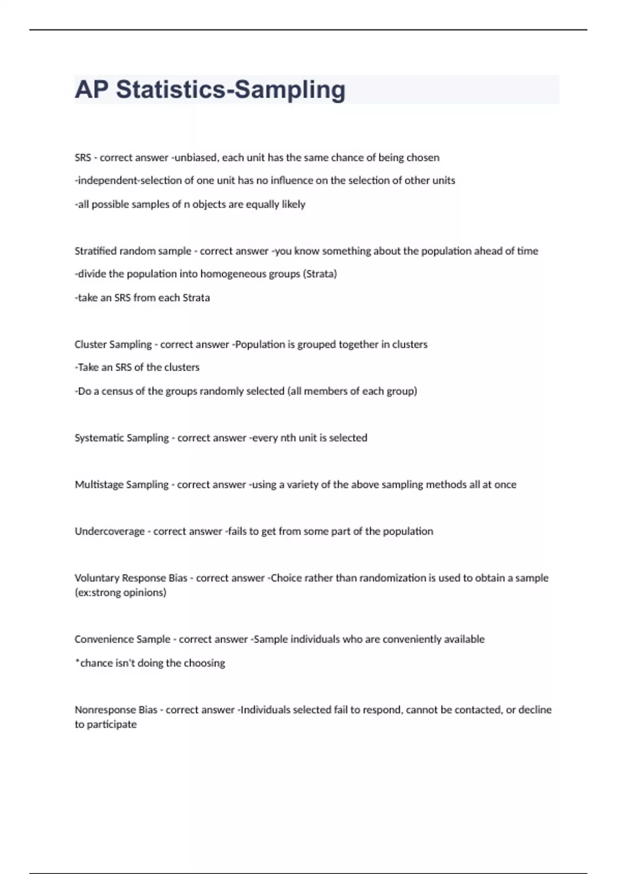 AP Statistics-Sampling Review Test Questions 2024. SRS - correct answer -unbiased, each unit has the same chance of being chosen -independent-selection of one unit has no influence on the selection of other units -all possible samples of n objects are equally likely Stratified random sample - correct answer -you know something about the population ahead of time -divide the population into homogeneous groups (Strata) -take an SRS from each Strata Cluster Sampling - correct answer -Population is grouped together in clusters -Take an SRS of the clusters -Do a census of the groups randomly selected (all members of each group) Systematic Sampling - correct answer -every nth unit is selected Multistage Sampling - correct answer -using a variety of the above sampling methods all at once Undercoverage - correct answer -fails to get from some part of the population Voluntary Response Bias - correct answer -Choice rather than randomization is used to obtain a sample (ex:strong opinions)