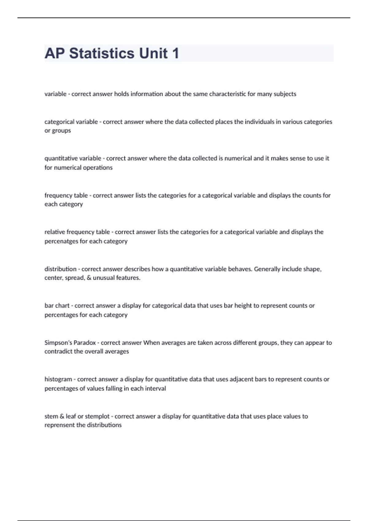 AP Statistics Unit 1 Prediction Questions 2024. variable - correct answer holds information about the same characteristic for many subjects categorical variable - correct answer where the data collected places the individuals in various categories or groups quantitative variable - correct answer where the data collected is numerical and it makes sense to use it for numerical operations frequency table - correct answer lists the categories for a categorical variable and displays the counts for each category relative frequency table - correct answer lists the categories for a categorical variable and displays the percenatges for each category distribution - correct answer describes how a quantitative variable behaves. Generally include shape, center, spread, & unusual features. bar chart - correct answer a display for categorical data that uses bar height to represent counts or percentages for each category Simpson's Paradox - correct answer When averages are taken across different groups, they can appear to contradict the overall averages histogram - correct answer a display for quantitative data that uses adjacent bars to represent counts or percentages of values falling in each interval