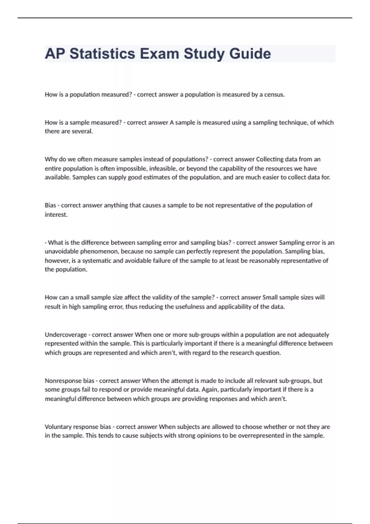 AP Statistics Exam Study Guide Questions With Solutions 2024. How is a population measured? - correct answer a population is measured by a census. How is a sample measured? - correct answer A sample is measured using a sampling technique, of which there are several. Why do we often measure samples instead of populations? - correct answer Collecting data from an entire population is often impossible, infeasible, or beyond the capability of the resources we have available. Samples can supply good estimates of the population, and are much easier to collect data for. Bias - correct answer anything that causes a sample to be not representative of the population of interest. · What is the difference between sampling error and sampling bias? - correct answer Sampling error is an unavoidable phenomenon, because no sample can perfectly represent the population. Sampling bias, however, is a systematic and avoidable failure of the sample to at least be reasonably representative of the population. How can a small sample size affect the validity of the sample? - correct answer Small sample sizes will result in high sampling error, thus reducing the usefulness and applicability of the data. Undercoverage - correct answer When one or more sub-groups within a population are not adequately represented within the sample. This is particularly important if there is a meaningful difference between which groups are represented and which aren't, with regard to the research question. Nonresponse bias - correct answer When the attempt is made to include all relevant sub-groups, but some groups fail to respond or provide meaningful data. Again, particularly important if there is a meaningful difference between which groups are providing responses and which aren't.