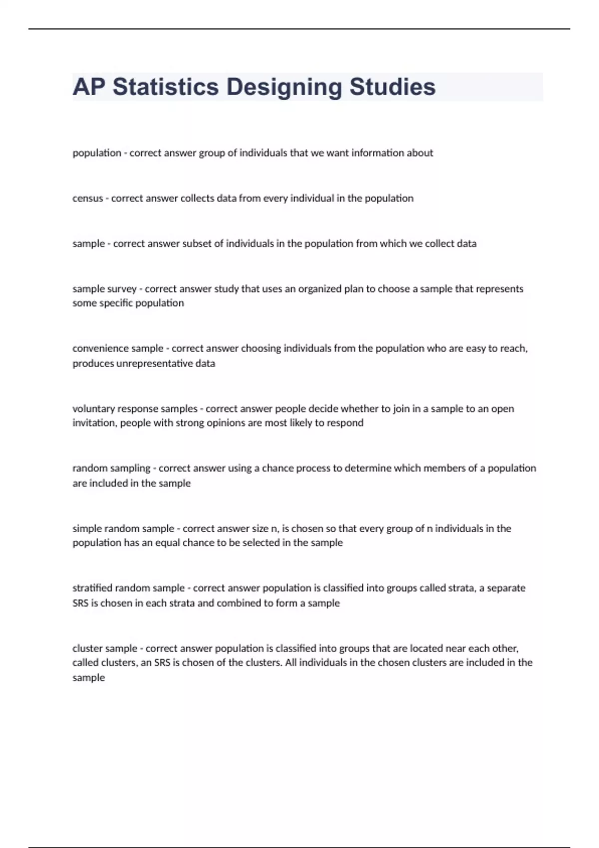 AP Statistics Designing Studies Exam Correctly Answered 2024. population - correct answer group of individuals that we want information about census - correct answer collects data from every individual in the population sample - correct answer subset of individuals in the population from which we collect data sample survey - correct answer study that uses an organized plan to choose a sample that represents some specific population convenience sample - correct answer choosing individuals from the population who are easy to reach, produces unrepresentative data voluntary response samples - correct answer people decide whether to join in a sample to an open invitation, people with strong opinions are most likely to respond random sampling - correct answer using a chance process to determine which members of a population are included in the sample simple random sample - correct answer size n, is chosen so that every group of n individuals in the population has an equal chance to be selected in the sample