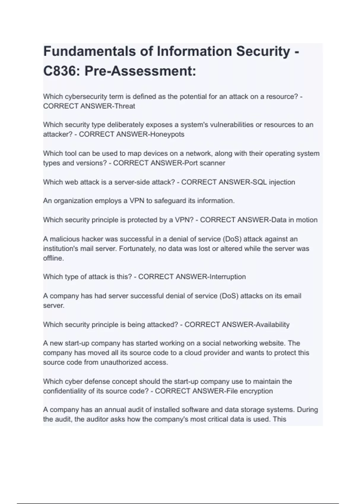 Fundamentals of Information Security - C836: Pre-Assessment: Questions And Answers Latest Updated 2024 With Complete Solution.