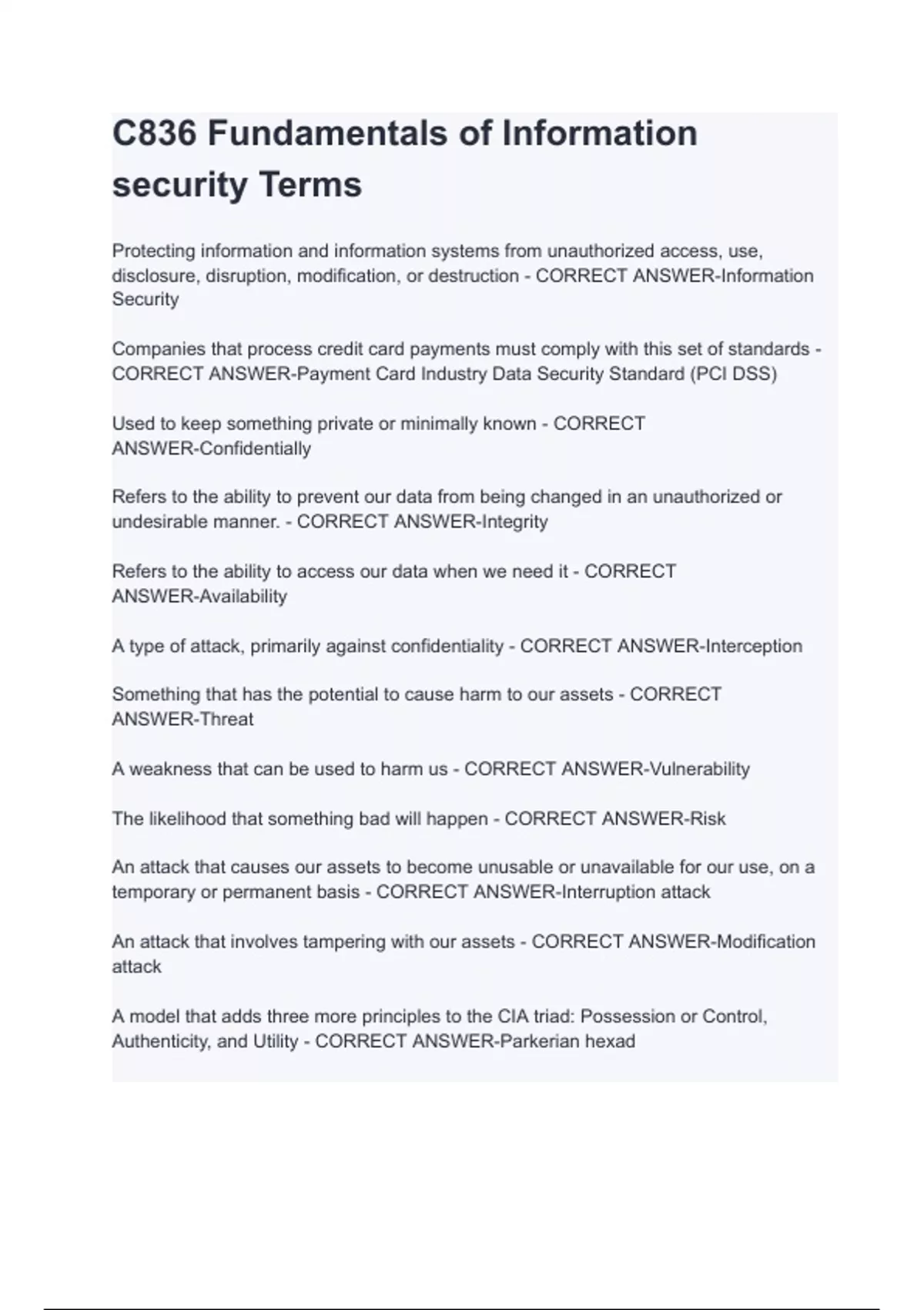 C836 Fundamentals of Information security Terms Protecting information and information systems from unauthorized access, use, disclosure, disruption, modification, or destruction - CORRECT ANSWER-Information Security Companies that process credit card payments must comply with this set of standards - CORRECT ANSWER-Payment Card Industry Data Security Standard (PCI DSS) Used to keep something private or minimally known - CORRECT ANSWER-Confidentially Refers to the ability to prevent our data from being changed in an unauthorized or undesirable manner. - CORRECT ANSWER-Integrity Refers to the ability to access our data when we need it - CORRECT ANSWER-Availability A type of attack, primarily against confidentiality - CORRECT ANSWER-Interception Something that has the potential to cause harm to our assets - CORRECT ANSWER-Threat A weakness that can be used to harm us - CORRECT ANSWER-Vulnerability The likelihood that something bad will happen - CORRECT ANSWER-Risk An attack that causes our assets to become unusable or unavailable for our use, on a temporary or permanent basis - CORRECT ANSWER-Interruption attack An attack that involves tampering with our assets - CORRECT ANSWER-Modification attack A model that adds three more principles to the CIA triad: Possession or Control, Authenticity, and U