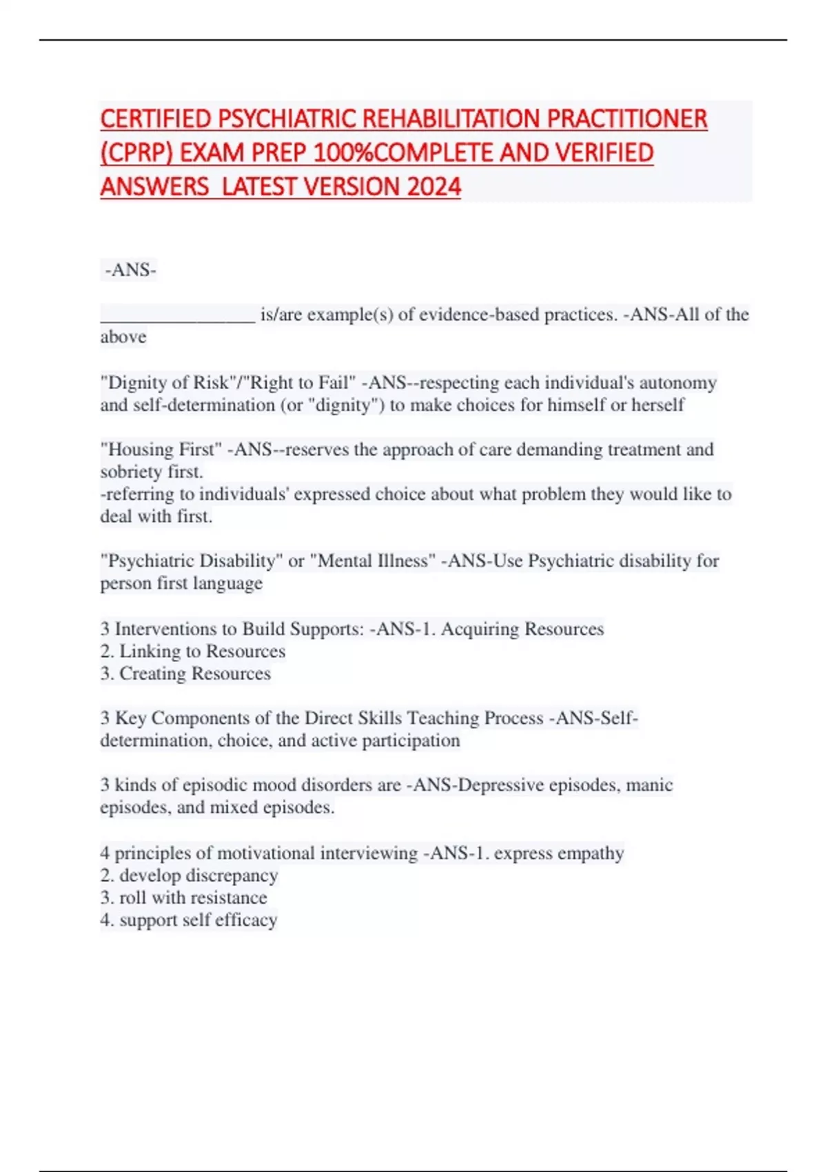 CERTIFIED PSYCHIATRIC REHABILITATION PRACTITIONER (CPRP) EXAM PREP 100%COMPLETE AND VERIFIED ANSWERS LATEST VERSION 2024