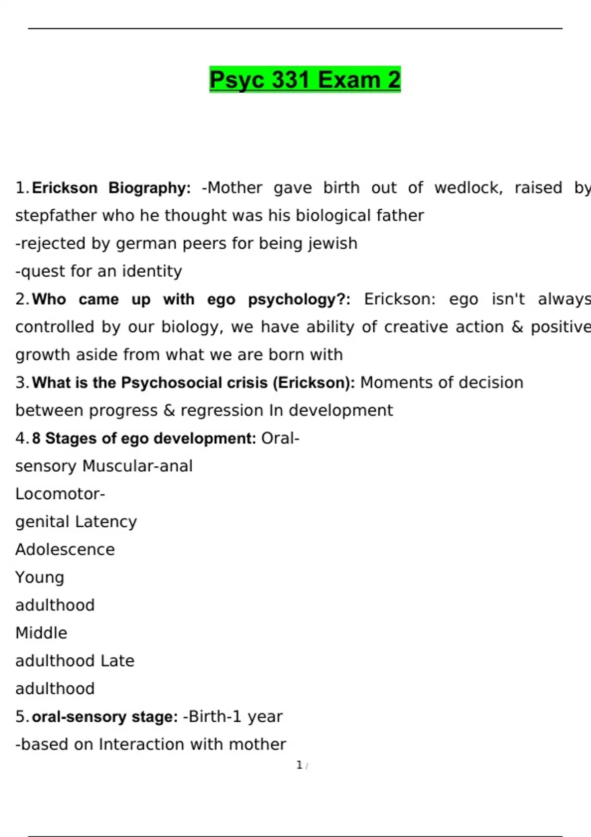 Erickson Biography correct answer: -Mother gave birth out of wedlock, raised by stepfather who he thought was his biological father -rejected by german peers for being jewish -quest for an identity Who came up with ego psychology? correct answer: Erickson: ego isn't always controlled by our biology, we have ability of creative action & positive growth aside from what we are born with What is the Psychosocial crisis (Erickson) correct answer: Moments of decision between progress & regression In development 8 Stages of ego development correct answer: Oral-sensory Muscular-anal Locomotor-genital Latency Adolescence Young adulthood Middle adulthood Late adulthood oral-sensory stage correct answer: -Birth-1 year -based on Interaction with mother -trust: continuity