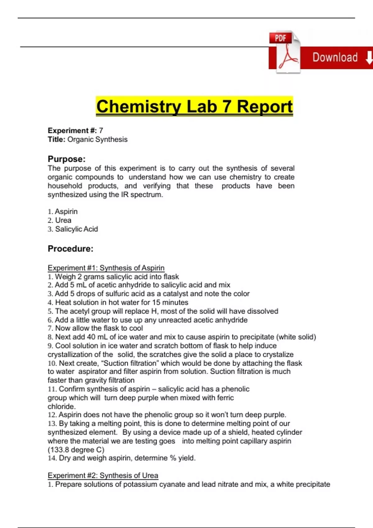 Summary CHEM 104 LAB 7 Organic Synthesis Complete 2024 / 2025 | 100% Verified