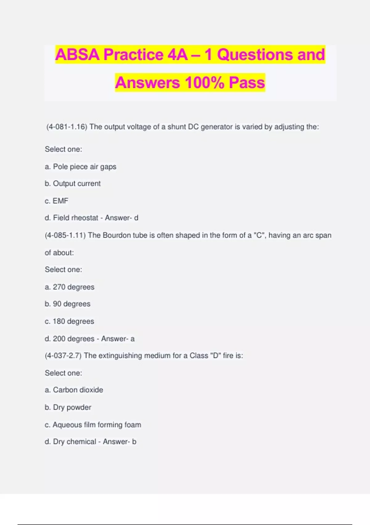 ABSA Practice 4A – 1 Questions and Answers 100% Pass (4-081-1.16) The output voltage of a shunt DC generator is varied by adjusting the: Select one: a. Pole piece air gaps b. Output current c. EMF d. Field rheostat - Answer- d (4-085-1.11) The Bourdon tube is often shaped in the form of a "C", having an arc span of about: Select one: a. 270 degrees b. 90 degrees c. 180 degrees d. 200 degrees - Answer- a (4-037-2.7) The extinguishing medium for a Class "D" fire is: Select one: a. Carbon dioxide b. Dry powder c. Aqueous film forming foam d. Dry chemical - Answer- b Besides a flashlight, what else is used during a visual inspection of a weld? Select one: a. microscopes b. fluorescent lights c. magnifying glasses d. chisels - Answer- c A PLC needs to be able to check itself for safe operation. This is called: Select one: a. Start up Check b. maintenance scan c. housekeeping scan d. Self check - Answer- c (4-050-1.1) A check valve____________________. Select one: a. Allows flow in one direction only. b. Uses a heavy spring for setting. c. requires an inspector's seal to be installed. d. Has a locking spindle for locking out flow for safety. - Answer- a (4-047-1.6) Submerged arc welding is a(an)_____ welding process. Select one: a. Oxy-acetylene b. AC electric c. AC or DC electric d. DC - Answer- c An SOP is used to Select one: a. Make sure each operator runs equipment in a consistently safe and efficient manner b. Keep track of maintenance costs c. Help plan equipment maintenance activities d. Develop PFDs and P&IDs - Answer- a (4-010-2.7) A 7m long bar is pivoted at 2m from the left end. A force of 60N is applied downwards on the left end and a force of 20N is applied downward on the right end. What would be the clockwise and counter-clockwise moments about the pivot, due to each force, and in which direction would the bar rotate? Select one: a. 120Nm counter-clockwise, 100Nm clockwise, clockwise rotation. b. 120Nm counter-clockwise, 100Nm clockwise, counter-clockwise rotation. c. 80Nm counter-clockwise, 100Nm clockwise, counter-clockwise rotation. d. 60Nm counter-clockwise, 100Nm clockwise, clockwise rotation. - Answer- b (4-014-2.1) What is the absolute pressure if the gauge pressure in a steam cylinder is 200kPa? (Atmospheric pressure is 101.3 kPa.) Select one: a. 200 kPa b. 200.3 kPa c. 301.3 Pa d. 301.3 kPa - Answer- d 4-049-2.8) The three general types of flange connections are the screwed, the Van Stone and the _____ . Select one: a. Ring joint b. Raised face c. Welded d. Bolted - Answer- c 4-056-1.8) Boiler chimneys are commonly lined with: Select one: a. Insulation b. Rubber c. Fire brick d. Concrete - Answer- c (4-047-1.15) The filler rod in braze welding is usually made of: Select one: a. Alloy steel b. Brass c. Aluminium d. Bronze - Answer- d (4-086-1.2) A sensing element sends its signal to Select one: a. a Recorder b. an air line c. a Conveyer d. a Transmitter - Answer- d When using a two-way radio, what do you say when you've heard the message but need to put the caller on hold? Select one: a. Roger that b. Copy that c. Standby d. Come again - Answer- c