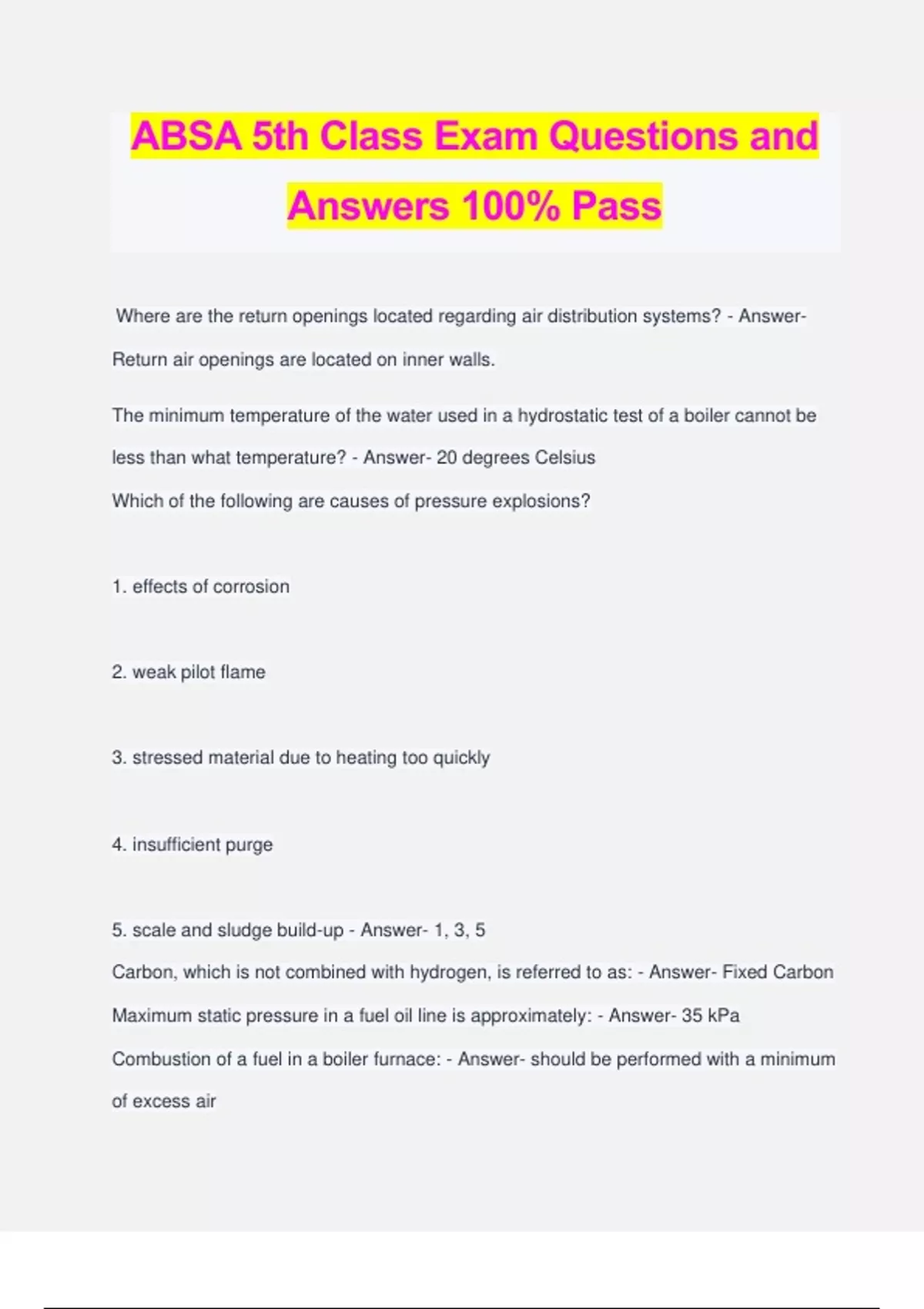 ABSA 5th Class Exam Questions and Answers 100% Pass Where are the return openings located regarding air distribution systems? - Answer- Return air openings are located on inner walls. The minimum temperature of the water used in a hydrostatic test of a boiler cannot be less than what temperature? - Answer- 20 degrees Celsius Which of the following are causes of pressure explosions? 1. effects of corrosion 2. weak pilot flame 3. stressed material due to heating too quickly 4. insufficient purge 5. scale and sludge build-up - Answer- 1, 3, 5 Carbon, which is not combined with hydrogen, is referred to as: - Answer- Fixed Carbon Maximum static pressure in a fuel oil line is approximately: - Answer- 35 kPa Combustion of a fuel in a boiler furnace: - Answer- should be performed with a minimum of excess air What is a hydrostatic test? - Answer- A way in which pressure vessels can be tested for strength and leaks. How often do burner and fan motors which uses standard bearing normally require lubrication? - Answer- Yearly On a hot water boiler, the pressure differential between the operating pressure and the safety relief valve set pressure must be (at a minimum): 1. 25% of operating pressure 2. 125% of operating pressure 3. 69 kPa 4. 25% of the safety relief valve set pressure - Answer- 3, 4 In hot water boiler operation the maximum operating temperature should never exceed: - Answer- 121 degrees celsius A substance, which will absorb humidity inside a boiler during dry lay up is: - Answer- Activated alumina When draft is produced by natural means: - Answer- cooler air surrounding the boiler increases draft Coal is composed of the following combustible components: - Answer- Carbon, hydrogen, Sulphur Which of the following are causes of furnace explosions? 1. main fuel valve closed when the burner flame is lost 2. insufficient purge 3. burners lit from hot refractory 4. effects of corrosion 5. admission of fuel before ignition source - Answer- 3,4,5 Which grade of oil is the most popular for domestic and small commercial boilers? - Answer- Grade 2 The inclined manometer as compared to the U manometer is what? - Answer- More accurate. How can the draft through a natural draft furnace be increased? - Answer- Increase the temperature of the stack The main function of a gas burner is: - Answer- provision of O2 - fuel contact The minimum distance from furnace to oil storage tank is: - Answer- 2 feet One of the main component of an electric ignition system is the step-up transformer which takes 120 V and boosts it to _____ volts - Answer- 10,000 - 12,000 volts. Combustion of a fuel in a boiler furnace should be performed in what conditions? - Answer- There should be a minimum of excess air. What type of oil burner is used when oil is supplied under high pressure? - Answer- Mechanical Atomizing Burner An air atomizing compressor is usually what type? - Answer- A rotary type. Which of the following advantages does oil have over coal as a boiler fuel? 1. requires less storage space 2. costs less to handle 3. fuel quantity is easier to control 4. burns more cleanly - Answer- All of the above In a boiler burner with 3 fixed capacity nozzles,the intermediate and high burner nozzles have higher capacities than the primary burner nozzle for what reason? - Answer- To allow better boiler warm-ups What is a manometer used for? - Answer- Measure draft A draft gauge on a furnace indicates the draft in: - Answer- mm of water column A solenoid type fuel gas valve is held close by what? - Answer- Fuel pressure Regarding a burner with 3 fixed capacity nozzles,the secondary and tertiary nozzles are ignited by: - Answer- Primary burner Ethane is a component of natural gas and constitutes a percent volume of: - Answer- 10-20% An interrupted pilot does what? - Answer- Lights, completes a trial, and extinguishes after the main flame is established. A very popular packaged boiler gas burner is the: - Answer- Ring burner An intermittent pilot does what? - Answer- Lights the main flame and remains on with it. Before atomization can occur, heavy oils are heated to approximately _____ degrees C. - Answer- 95 A fuel storage tank must be located a minimum of ____ away from the furnace - Answer- 2 feet A refractory burner disadvantage is: - Answer- High initial cost Maximum static pressure in a fuel oil line is approximately what? - Answer- 35 KPA When a gas fired burner is burning fuel properly a) it will have a blue flame with short yellow tips b) the furnace will pulsate c) there will be no turbulence d) it will have a long bright yellow flame e) the induced draft fan can be shut off - Answer- A In a forced draft system, the furnace pressure is: -