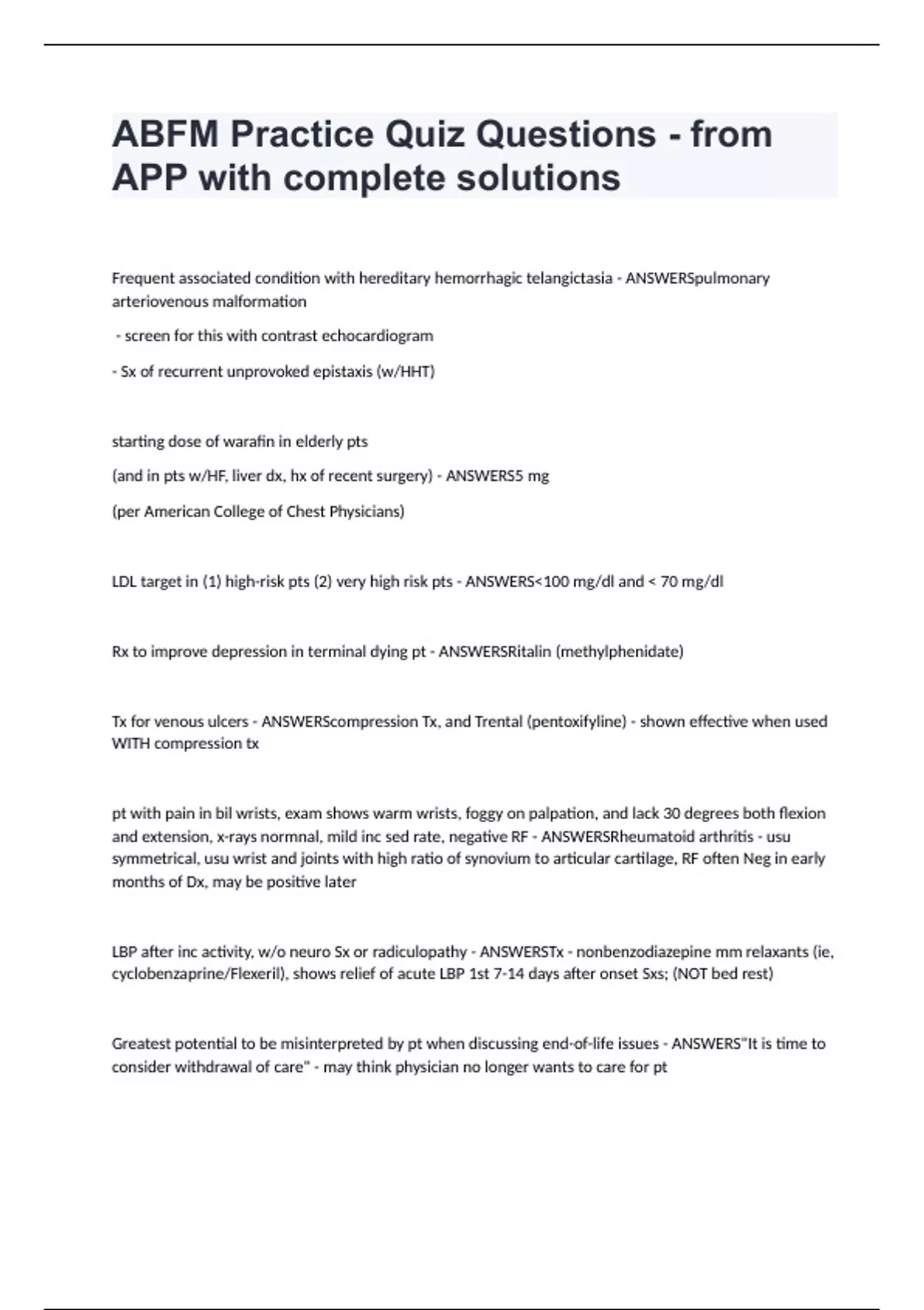 ABFM Practice Quiz Questions - from APP with complete solutions Frequent associated condition with hereditary hemorrhagic telangictasia - ANSWERSpulmonary arteriovenous malformation - screen for this with contrast echocardiogram - Sx of recurrent unprovoked epistaxis (w/HHT) starting dose of warafin in elderly pts (and in pts w/HF, liver dx, hx of recent surgery) - ANSWERS5 mg (per American College of Chest Physicians) LDL target in (1) high-risk pts (2) very high risk pts - ANSWERS<100 mg/dl and < 70 mg/dl Rx to improve depression in terminal dying pt - ANSWERSRitalin (methylphenidate) Tx for venous ulcers - ANSWERScompression Tx, and Trental (pentoxifyline) - shown effective when used WITH compression tx pt with pain in bil wrists, exam shows warm wrists, foggy on palpation, and lack 30 degrees both flexion and extension, x-rays normnal, mild inc sed rate, negative RF - ANSWERSRheumatoid arthritis - usu symmetrical, usu wrist and joints with high ratio of synovium to articular cartilage, RF often Neg in early months of Dx, may be positive later LBP after inc activity, w/o neuro Sx or radiculopathy - ANSWERSTx - nonbenzodiazepine mm relaxants (ie, cyclobenzaprine/Flexeril), shows relief of acute LBP 1st 7-14 days after onset Sxs; (NOT bed rest) Greatest potential to be misinterpreted by pt when discussing end-of-life issues - ANSWERS"It is time to consider withdrawal of care" - may think physician no longer wants to care for pt