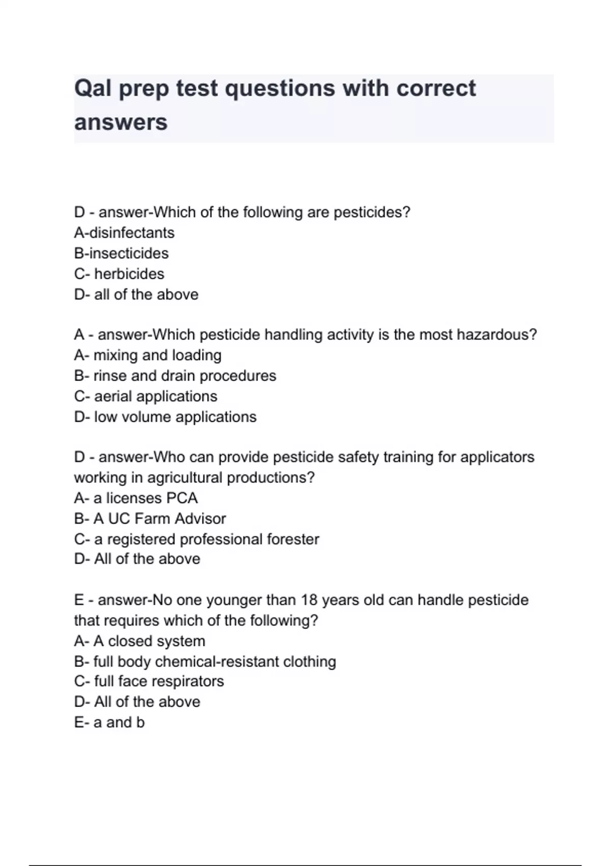 D - answer-Which of the following are pesticides? A-disinfectants B-insecticides C- herbicides D- all of the above A - answer-Which pesticide handling activity is the most hazardous? A- mixing and loading B- rinse and drain procedures C- aerial applications D- low volume applications D - answer-Who can provide pesticide safety training for applicators working in agricultural productions? A- a licenses PCA B- A UC Farm Advisor C- a registered professional forester D- All of the above E - answer-No one younger than 18 years old can handle pesticide that requires which of the following? A- A closed system B- full body chemical-resistant clothing C- full face respirator