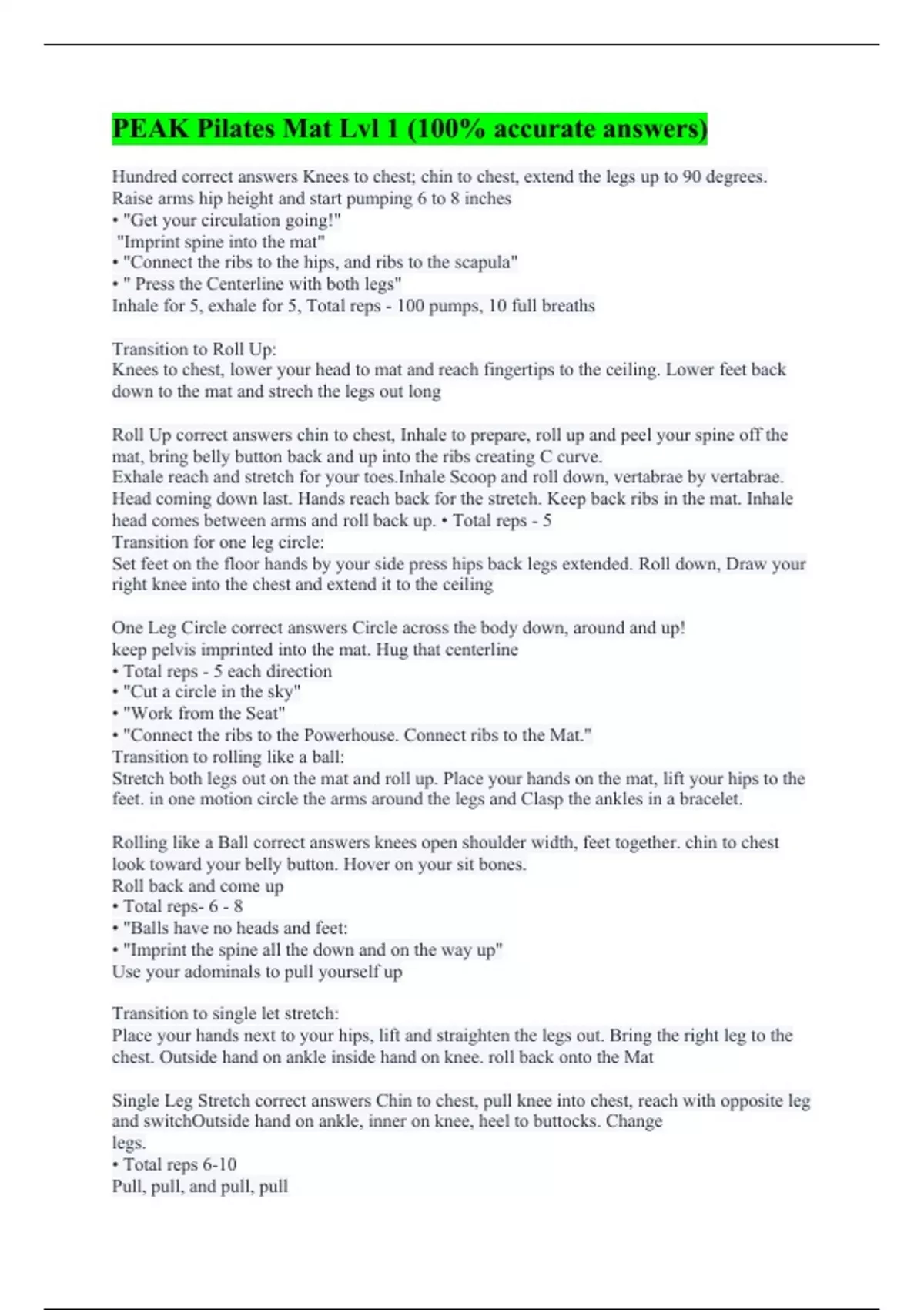 PEAK Pilates Mat Lvl 1 (100% accurate answers)