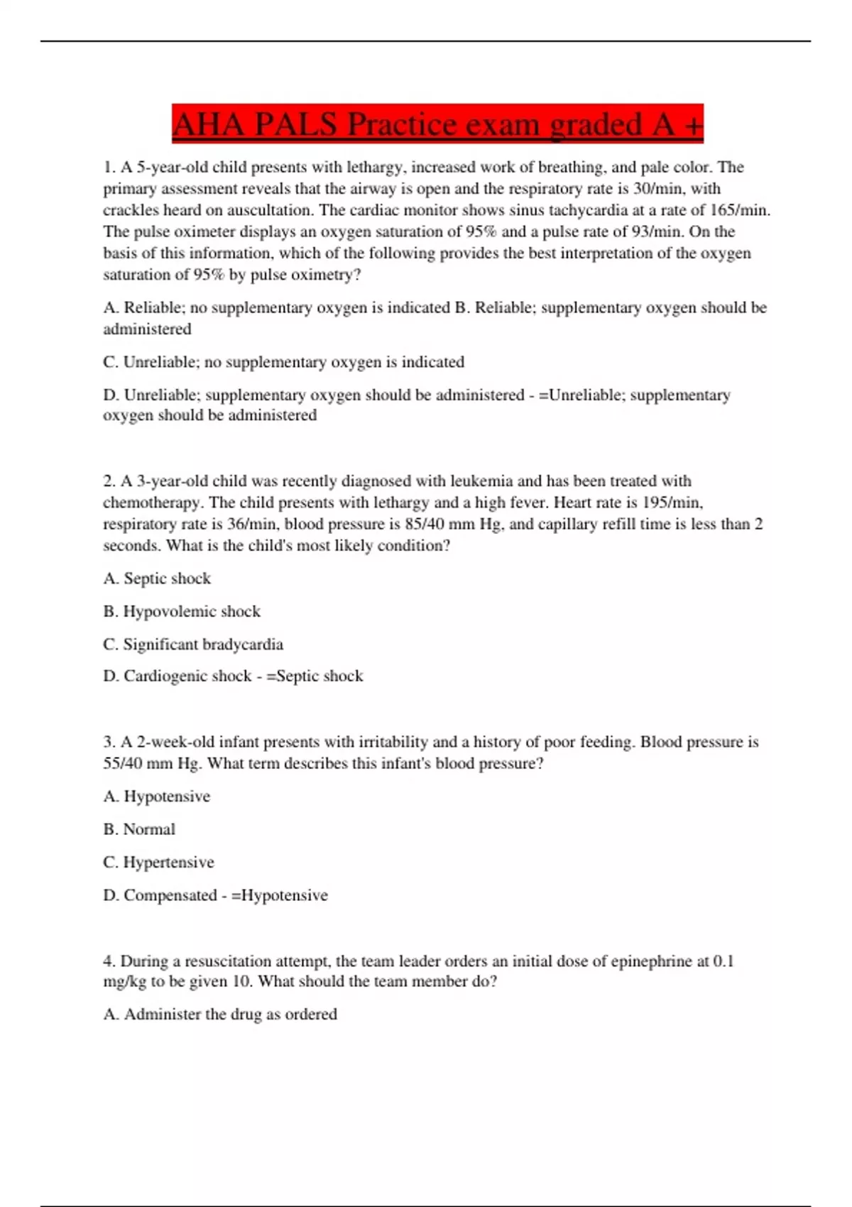 AHA PALS Practice exam graded A +