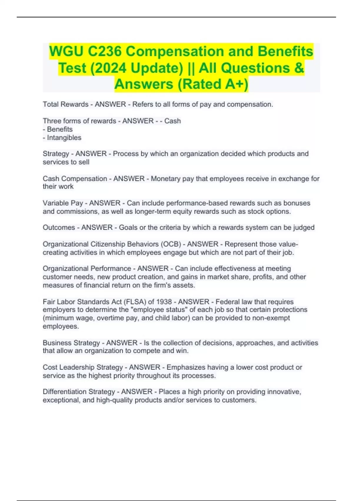 WGU C236 Compensation and Benefits Test (2024 Update) || All Questions & Answers (Rated A+) WGU C236 Compensation and Benefits Test (2024 Update) || All Questions & Answers (Rated A+) Total Rewards - ANSWER - Refers to all forms of pay and compensation. Three forms of rewards - ANSWER - - Cash - Benefits - Intangibles Strategy - ANSWER - Process by which an organization decided which products and services to sell Cash Compensation - ANSWER - Monetary pay that employees receive in exchange for their work Variable Pay - ANSWER - Can include performance-based rewards such as bonuses and commissions, as well as longer-term equity rewards such as stock options. Outcomes - ANSWER - Goals or the criteria by which a rewards system can be judged Organizational Citizenship Behaviors (OCB) - ANSWER - Represent those value-creating activities in which employees engage but which are not part of their job. Organizational Performance - ANSWER - Can include effectiveness at meeting customer needs, new product creation, and gains in market share, profits, and other measures of financial return on the firm's assets. Fair Labor Standards Act (FLSA) of 1938 - ANSWER - Federal law that requires employers to determine the "employee status" of each job so that certain protections (minimum wage, overtime pay, and child labor) can be provided to non-exempt employees. Business Strategy - ANSWER - Is the collection of decisions, approaches, and activities that allow an organization to compete and win. Cost Leadership Strategy - ANSWER - Emphasizes having a lower cost product or service as the highest priority throughout its processes. Differentiation Strategy - ANSWER - Places a high priority on providing innovative, exceptional, and high-quality products and/or services to customers. Niche-Focused Strategy - ANSWER - In which an organization chooses a small and segmented market and competes only in that small arena. Hybrid Strategy - ANSWER - Employing a combination of cost leadership, differentiation, and niche focused business strategies. Critical Success Factors - ANSWER - Are those capabilities, activities, customer perceptions, and market positions that allow an organization to outcompete its rivals