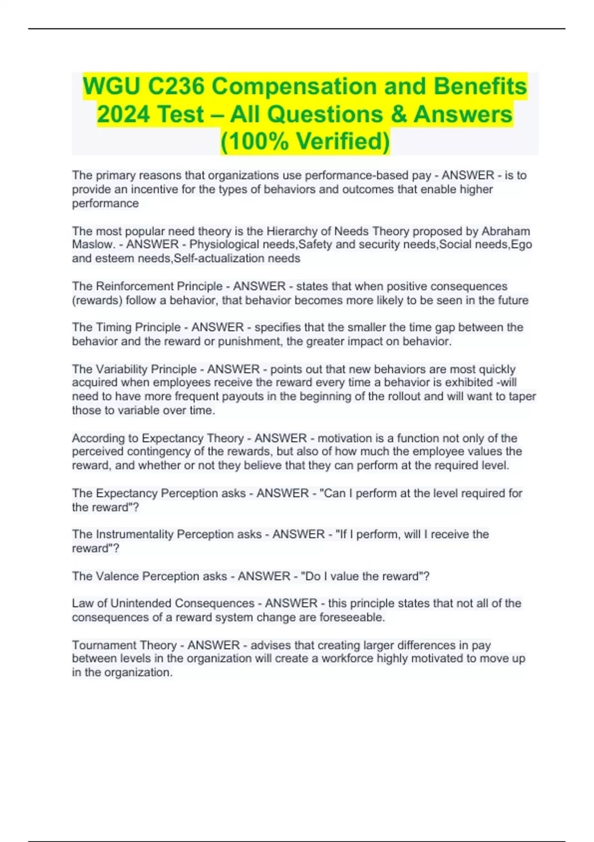 WGU C236 Compensation and Benefits 2024 Test – All Questions & Answers (100% Verified) WGU C236 Compensation and Benefits 2024 Test – All Questions & Answers (100% Verified) The primary reasons that organizations use performance-based pay - ANSWER - is to provide an incentive for the types of behaviors and outcomes that enable higher performance The most popular need theory is the Hierarchy of Needs Theory proposed by Abraham Maslow. - ANSWER - Physiological needs,Safety and security needs,Social needs,Ego and esteem needs,Self-actualization needs The Reinforcement Principle - ANSWER - states that when positive consequences (rewards) follow a behavior, that behavior becomes more likely to be seen in the future The Timing Principle - ANSWER - specifies that the smaller the time gap between the behavior and the reward or punishment, the greater impact on behavior. The Variability Principle - ANSWER - points out that new behaviors are most quickly acquired when employees receive the reward every time a behavior is exhibited -will need to have more frequent payouts in the beginning of the rollout and will want to taper those to variable over time. According to Expectancy Theory - ANSWER - motivation is a function not only of the perceived contingency of the rewards, but also of how much the employee values the reward, and whether or not they believe that they can perform at the required level. The Expectancy Perception asks - ANSWER - "Can I perform at the level required for the reward"? The Instrumentality Perception asks - ANSWER - "If I perform, will I receive the reward"? The Valence Perception asks - ANSWER - "Do I value the reward"? Law of Unintended Consequences - ANSWER - this principle states that not all of the consequences of a reward system change are foreseeable. Tournament Theory - ANSWER - advises that creating larger differences in pay between levels in the organization will create a workforce highly motivated to move up in the organization. Distributive Justice - ANSWER - It is also known as Equity Theory, and is based on comparisons between the ratio of employees' inputs and rewards to the ratio of inputs and rewards of others.