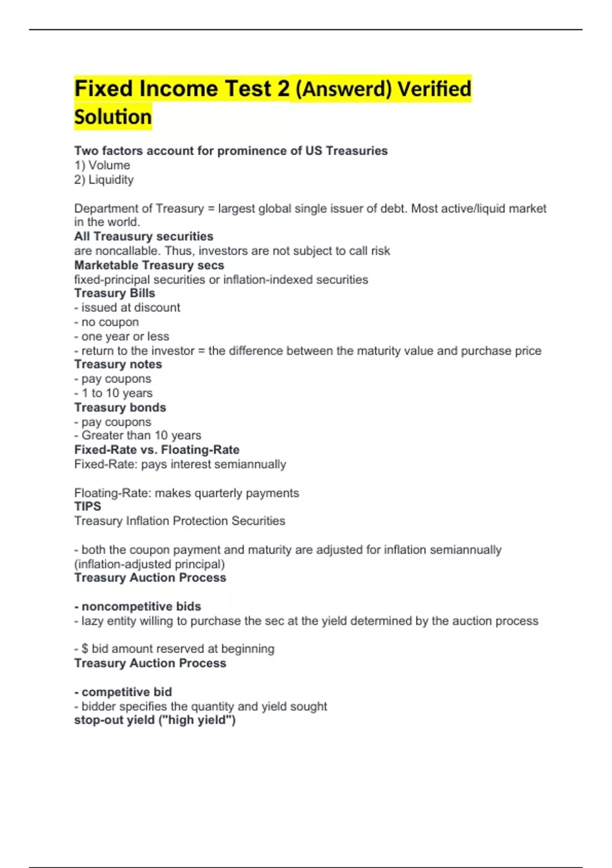 Fixed Income Test 2 (Answerd) Verified Solution Two factors account for prominence of US Treasuries 1) Volume 2) Liquidity Department of Treasury = largest global single issuer of debt. Most active/liquid market in the world. All Treausury securities are noncallable. Thus, investors are not subject to call risk Marketable Treasury secs fixed-principal securities or inflation-indexed securities Treasury Bills - issued at discount - no coupon - one year or less - return to the investor = the difference between the maturity value and purchase price Treasury notes - pay coupons - 1 to 10 years Treasury bonds - pay coupons - Greater than 10 years Fixed-Rate vs. Floating-Rate Fixed-Rate: pays interest semiannually Floating-Rate: makes quarterly payments TIPS Treasury Inflation Protection Securities - both the coupon payment and maturity are adjusted for inflation semiannually (inflation-adjusted principal) Treasury Auction Process - noncompetitive bids - lazy entity willing to purchase the sec at the yield determined by the auction process - $ bid amount reserved at beginning Treasury Auction Process - competitive bid - bidder specifies the quantity and yield sought stop-out yield ("high yield") - The highest yield accepted by the Treasury - everyone gets it on-the-run issue ("current issue") most recently auctioned issue when-issued market - when Treasury securities are traded prior to the time they are issued Treasury bills are quoted on... bond discount basis (not price basis) Price Quoted on TBills Formula Y = (D/F) * (360/t) bond equivalent yield - the measure that seeks to make the TBill quote comparable to Treasury notes & bonds - CD equivalent yield also does the same taking into consideration the price of a TBill 91-19+ 19/32 + 1/64 = 91.0609375 107-222 22/32 + 2/256 = 107.6953125 109-066 6/32 + 6/256 = 109.2109375 Accrued Interest - investor compensating the seller of a bond for the coupon interest earned from the time of the last coupon payment to the settlement date - number of days = days in which the investor has earned interest trade date date on which the transaction is executed settlement date transaction completed (next day) Interest accrues... - from the date including the previous coupon payment - up to (but excluding) the settlement date For Treasury coupon securities... the actual day count convention is used Coupon stripping (STRIPS)