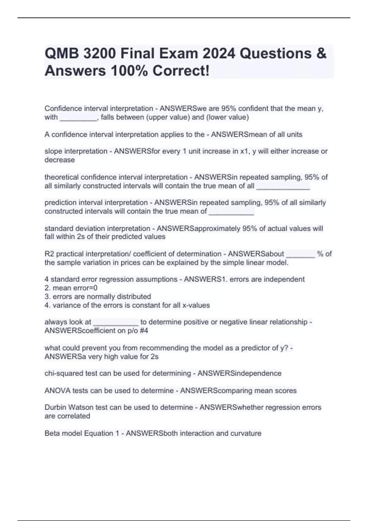 Confidence interval interpretation - ANSWERSwe are 95% confident that the mean y, with _________, falls between (upper value) and (lower value) A confidence interval interpretation applies to the - ANSWERSmean of all units slope interpretation - ANSWERSfor every 1 unit increase in x1, y will either increase or decrease theoretical confidence interval interpretation - ANSWERSin repeated sampling, 95% of all similarly constructed intervals will contain the true mean of all _____________ prediction interval interpretation - ANSWERSin repeated sampling, 95% of all similarly constructed intervals will contain the true mean of ___________ standard deviation interpretation - ANSWERSapproximately 95% of actual values will fall within 2s of their predicted values R2 practical interpretation/ coefficient of determination - ANSWERSabout _______ % of the sample variation in prices can be explained by the simple linear model. 4 standard error regression assumptions - ANSWERS1. errors are independent 2. mean error=0 3. errors are normally distributed 4. variance of the errors is constant for all x-values always look at ___________ to determine positive or negative linear relationship - ANSWERScoefficient on p/o #4 what could prevent you from recommending the model as a predictor of y? - ANSWERSa very high value for 2s chi-squared test can be used for determining - ANSWERSindependence ANOVA tests can be used to determine - ANSWERScomparing mean scores Durbin Watson test can be used to determine - ANSWERSwhether regression errors are correlated Beta model Equation 1 - ANSWERSboth interaction and curvature E(y)= b0+b1x1+b2(x1)^2+b3x3+b4x1x1+b5(x1)^2x2