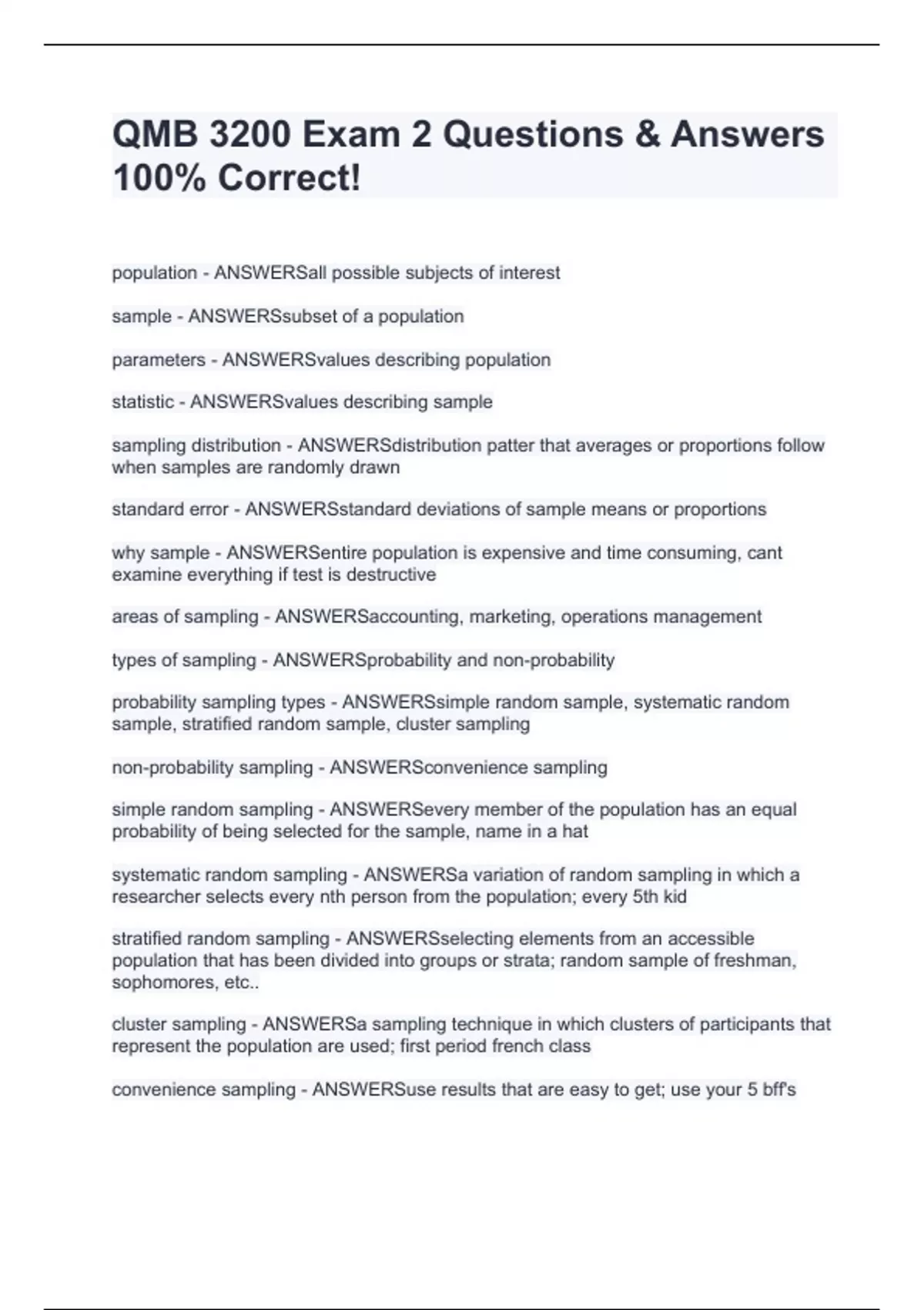 qmb 3200 exam 2 questions answers stuvia