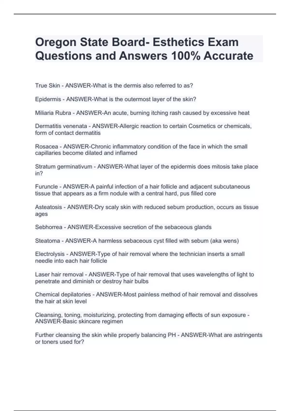 Oregon State Board- Esthetics Exam Questions and Answers 100% Accurate Oregon State Board- Esthetics Exam Questions and Answers 100% Accurate Oregon State Board- Esthetics Exam Questions and Answers 100% Accurate True Skin - ANSWER-What is the dermis also referred to as? Epidermis - ANSWER-What is the outermost layer of the skin? Miliaria Rubra - ANSWER-An acute, burning itching rash caused by excessive heat