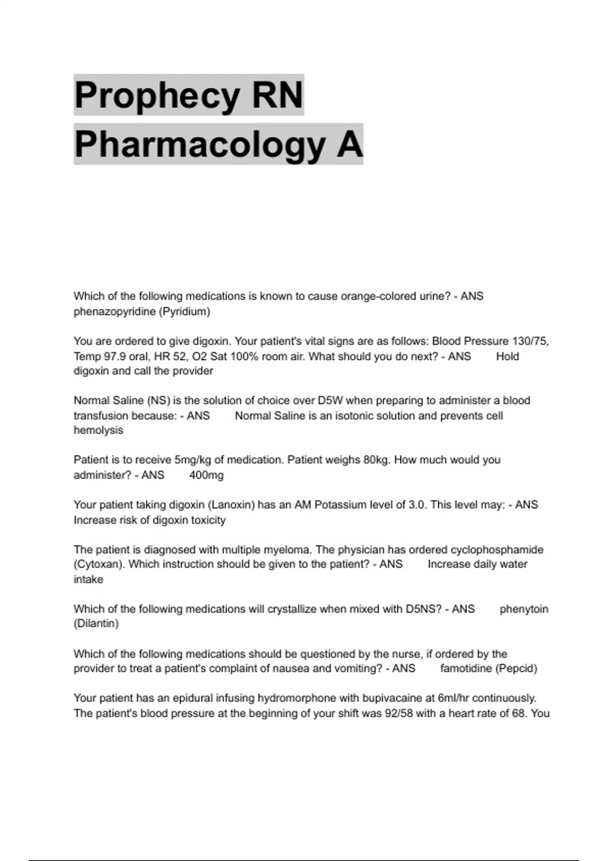 Prophecy RN Pharmacology A Which of the following medications is known to cause orange-colored urine? - ANS phenazopyridine (Pyridium) You are ordered to give digoxin. Your patient's vital signs are as follows: Blood Pressure 130/75, Temp 97.9 oral, HR 52, O2 Sat 100% room air. What should you do next? - ANS Hold digoxin and call the provider Normal Saline (NS) is the solution of choice over D5W when preparing to administer a blood transfusion because: - ANS Normal Saline is an isotonic solution and prevents cell hemolysis Patient is to receive 5mg/kg of medication. Patient weighs 80kg. How much would you administer? - ANS 400mg Your patient taking digoxin (Lanoxin) has an AM Potassium level of 3.0. This level may: - ANS Increase risk of digoxin toxicity The patient is diagnosed with multiple myeloma. The physician has ordered cyclophosphamide (Cytoxan). Which instruction should be given to the patient? - ANS Increase daily water intake Which of the following medications will crystallize when mixed with D5NS? - ANS phenytoin (Dilantin) Which of the following medications should be questioned by the nurse, if ordered by the provider to treat a patient's complaint of nausea and vomiting? - ANS famotidine (Pepcid) Your patient has an epidural infusing hydromorphone with bupivacaine at 6ml/hr continuously. The patient's blood pressure at the beginning of your shift was 92/58 with a heart rate of 68. You noticed the patient's blood pressures have been around 130/70. What should you do FIRST? - ANS Check infusion rate to confirm 6ml/hr, then notify anesthesia provider The dosage of which drug must be tapered off slowly to prevent acute adrenal insufficiency? - ANS prednisone (Deltasone) When teaching a new nurse on how to administer IV push furosemide (Lasix), you emphasize that it should be given over two minutes to avoid: - ANS tinnitus A nurse is caring for a patient with hyperparathyroidism and notes that the patient's serum calcium level is 13mg/dl. Which medication should the nurse prepare to administer as prescribed to the patient? - ANS calcitonin (Miacalcin