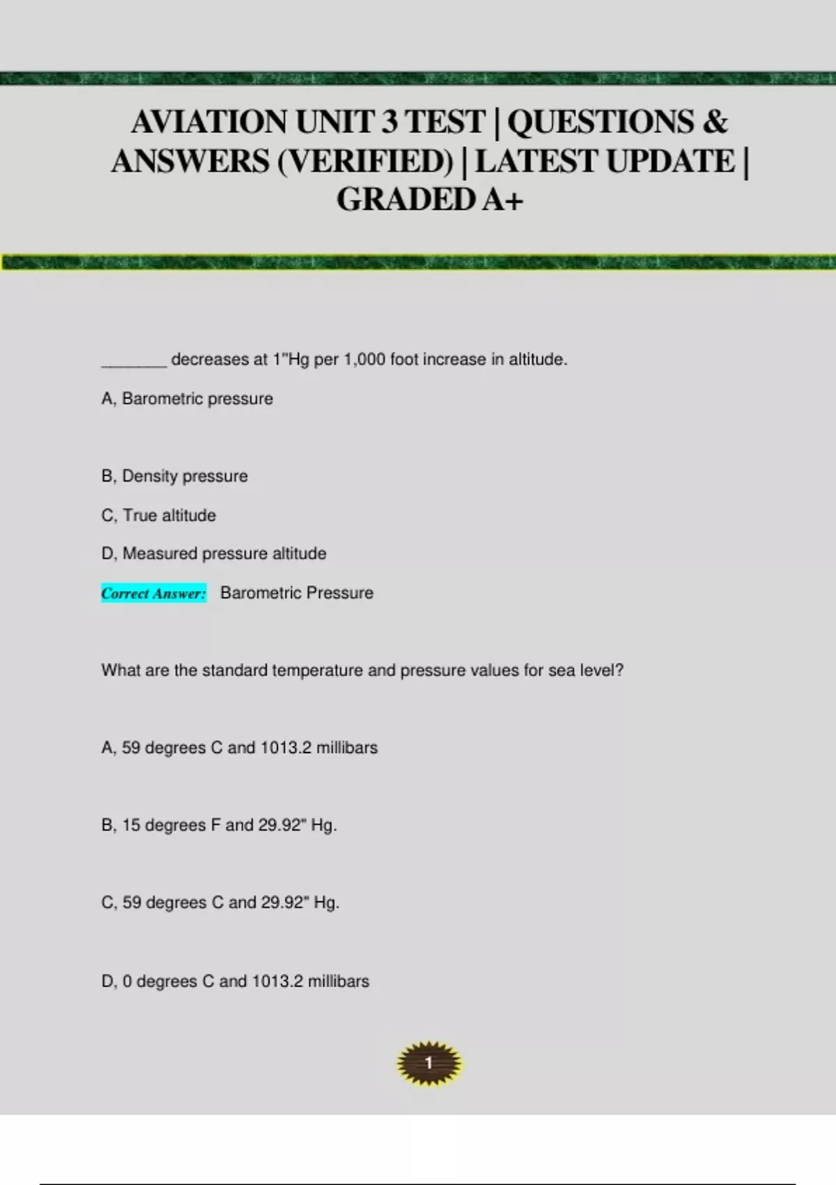 AVIATION UNIT 3 TEST | QUESTIONS & ANSWERS (VERIFIED) | LATEST UPDATE | GRADED A+ _______ decreases at 1''Hg per 1,000 foot increase in altitude. A, Barometric pressure B, Density pressure C, True altitude D, Measured pressure altitude Correct Answer: Barometric Pressure What are the standard temperature and pressure values for sea level? A, 59 degrees C and 1013.2 millibars B, 15 degrees F and 29.92" Hg. C, 59 degrees C and 29.92" Hg. D, 0 degrees C and 1013.2 millibars