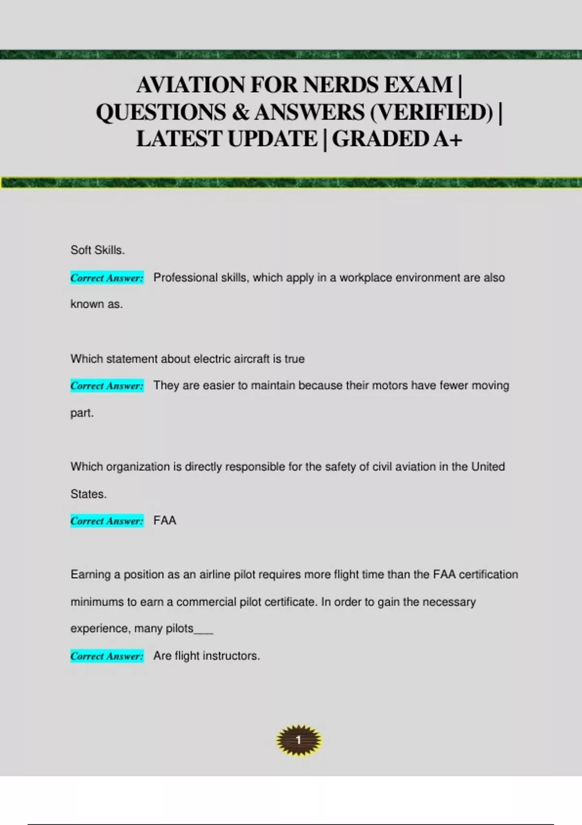 AVIATION FOR NERDS EXAM | QUESTIONS & ANSWERS (VERIFIED) | LATEST UPDATE | GRADED A+ Soft Skills. Correct Answer: Professional skills, which apply in a workplace environment are also known as. Which statement about electric aircraft is true Correct Answer: They are easier to maintain because their motors have fewer moving part. Which organization is directly responsible for the safety of civil aviation in the United States. Correct Answer: FAA Earning a position as an airline pilot requires more flight time than the FAA certification minimums to earn a commercial pilot certificate. In order to gain the necessary experience, many pilots___ Correct Answer: Are flight instructors. 2 How does the FAA play a role in commercial space travel? Correct Answer: Issues licenses for launches and space port operations WHich of the following is not one of the three key factors that defines an aircraft accident Correct Answer: Evidence of pilot error A mission statement is___ Correct Answer: A short statement describing the purpose or vision of a person or organization. When the NTSB investigates an accident, at what stage of the investigation is the go team formed Correct Answer: Notification and initial respons