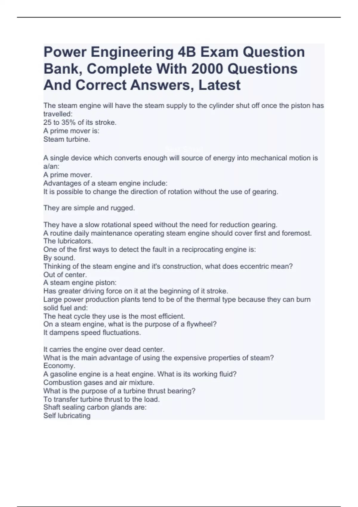 Power Engineering 4B Exam Question Bank, Complete With 2000 Questions And Correct Answers, Latest The steam engine will have the steam supply to the cylinder shut off once the piston has travelled: 25 to 35% of its stroke. A prime mover is: Steam turbine. Best Small A single device which converts enough will source of energy into mechanical motion is a/an: A prime mover. Advantages of a steam engine include: It is possible to change the direction of rotation without the use of gearing. They are simple and rugged. They have a slow rotational speed without the need for reduction gearing. A routine daily maintenance operating steam engine should cover first and foremost. The lubricators. One of the first ways to detect the fault in a reciprocating engine is: By sound. Thinking of the steam engine and it's construction, what does eccentric mean? Out of center. A steam engine piston: Has greater driving force on it at the beginning of it stroke. Large power production plants tend to be of the thermal type because they can burn solid fuel and: The heat cycle they use is the most efficient. On a steam engine, what is the purpose of a flywheel? It dampens speed fluctuations. It carries the engine over dead center. What is the main advantage of using the expensive properties of steam? Economy. A gasoline engine is a heat engine. What is its working fluid? Combustion gases and air mixture. What is the purpose of a turbine thrust bearing? To transfer turbine thrust to the load. Shaft sealing carbon glands are: Self lubricating In a turbine with a pressure lubrication system, The high-pressure oil generally goes to the governor system. Where is the low-pressure oil led? To the bearings. What holds a turbines carbon packing rings axially? Spring pressure. Steam pressure. For what purpose is lubricating oil required on a turbine, beside lubrication? To carry heat away from the bearings. In an impulse turbine: The steam pressure is reduced in the nozzles. Reaction turbines: Have a pressure dropped through the moving and stationary blades. Blades or Buckets form the rotor flow passages in the impulse turbines. A steam turbine should trip or shut down when normal operating speed is exceeded by: 10 to 15%. The handwheel used to adjust the turbine speed on the governor is known as the. Speeder. How many basic types of turbines are there? Two. A large reaction turbine will have: Steam pressure dropping through moving and stationary sections Impulse turbines: Have no pressure drop through the moving blades. What do the stationary nozzles of an impulse turbine convert the thermal energy of the steam into? Kinetic energy. The steam turbines exhaust can often supply the process with steam because: It is free of oil. When the steam pressure drop occurs in only the stationary members or components of a turbine, the turbine is known as: An impulse unit. Most turbine overspeed trips operate by: Centrifugal force. A large reaction turbine will have: Steam pressure dropping through moving and stationary section Starting from the boiler and simple power generation cycle, numbering the following components in the order in which the steam/water flows through the cycle. One - boiler feed pump Two - condenser Three- turbine Four - condensate pump Five- feed water heater The great majority of turbine governors are of the Mechanical centrifugal type Turbine overspeed trip: Will close the steam stop valve to the turbine Turbine lubricating oil : Can be used to operate the turbine governor The turbine overspeed trip: Prevents the turbine exceeding the maximum rated speed. Will close the steam stop valve. What is the purpose of the nozzles in the turbine? To increase steam velocities In the turbine with the pressure lubrication system, the high-pressure oil generally goes to the governor system. Where is the low pressure oil led? To the bearings. The overspeed trip of a steam turbine: Is installed on all turbines. The purpose of the turbine glands is to prevent: Steam escaping from the turbine. What is the purpose of a turbine thrust bearing? To transfer turbine thrust to the load. When warming up a turbine: Warm-up is done slowly. The turbine is slowly rotated. The warm-up must be done so that warping is prevented. What are some advantages of the pressure system on the turbine? Minimal maintenance required. Reliable service. Long bearing life. The shrouding installed on the blading of the steam turbine serves to: Confine the steam to the blades. When preparing a turbine for starts, why is it warmed up slowley? To prevent warping. What gives wood its strength? Cellulose. Natural draft cooling towers operate most effectively in large open spaces and: Where wind is relatively constant. Water contained in the airstream at the discharge of the cooling tower is removed: With drift eliminators. Induced draft crossflow cooling tower. In cooling towers, protective films and sacrificial metals are two methods of protecting against what? Corrosion. What is the purpose of the cooling tower? To reduce the temperature of cooling water For water temperatures up to 70°, increase of temperatures of 15 to 30° cause corrosion rates and cooling towers: To double. Micro organisms require carbon to develop. Where would they get this carbon from in the cooling tower? From the cellulose in the wood. Which of the following methods could be used to circulate air in a cooling tower? Induced draft fans. Natural draft. Convection currents. What could happen if the initial treatment of film forming chemicals, in the cooling tower, is to weak? Severe corrosion in unprotected areas is possible. The average amount of water volume, which evaporates from a cooling tower is: 5%. What is steel corrosion in cooling towers mainly due to? Dissolved oxygen. Delignification in a cooling towers wood is the result of: Chemicals such as chlorine. What are advantages of Venturi towers? No fan is required. It is quiet. No fill is required. Reduced maintenance requiremen