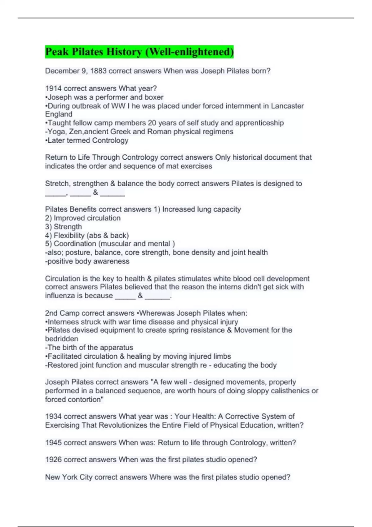 December 9, 1883 correct answers When was Joseph Pilates born? 1914 correct answers What year? •Joseph was a performer and boxer •During outbreak of WW I he was placed under forced internment in Lancaster England •Taught fellow camp members 20 years of self study and apprenticeship -Yoga, Zen,ancient Greek and Roman physical regimens •Later termed Contrology Return to Life Through Contrology correct answers Only historical document that indicates the order and sequence of mat exercises Stretch, strengthen & balance the body correct answers Pilates is designed to _____, _____ & ______ Pilates Benefits correct answers 1) Increased lung capacity 2) Improved circulation 3) Strength 4) Flexibility (abs & back) 5) Coordination (muscular and mental ) -also; posture, balance, core strength, bone density and joint health -positive body awareness Circulation is the key to health & pilates stimulates white blood cell development correct answers Pilates believed that the reason the interns didn't get sick with influenza is because _____ & ______. 2nd Camp correct answers •Wherewas Joseph Pilates when: •Internees struck with war time disease and physical injury •Pilates devised equipment to create spring resistance & Movement for the bedridden -The birth of the apparatus •Facilitated circulation & healing by moving injured limbs -Restored joint function and muscular strength re - educating the body Joseph Pilates correct answers "A few well - designed movements, properly performed in a balanced sequence, are worth hours of doing sloppy calisthenics or forced contortion" 1934 correct answers What year was : Your Health: A Corrective System of Exercising That Revolutionizes the Entire Field of Physical Education, written? 1945 correct answers When was: Return to life through Contrology, written? 1926 correct answers When was the first pilates studio opened? New York City correct answers Where was the first pilates studio opened?