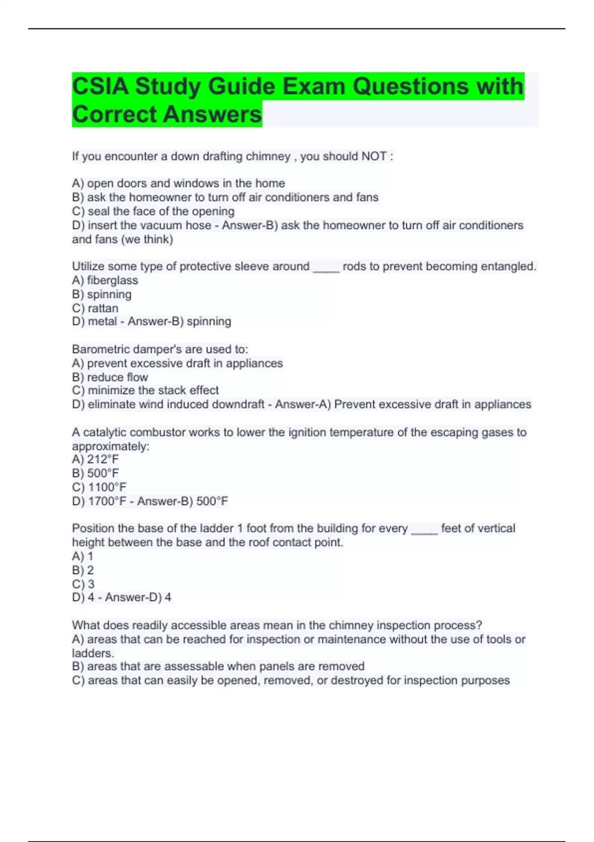CSIA Study Guide Exam Questions with Correct Answers Sleet, cedar shake, and tile roofs: A) are difficult to break B) break easily, and can be extremely slippery C) are easier to walk on than asphalt shingles D) will not be slippery when wet - Answer-B) break easily, and can be extremely slippery What is the primary concern regarding aromatic hydrocarbons? A) they are known carcinogens B) they are associated with rabies C) they can severely burn your skin D) they produce a pungent creosote odor - Answer-A) they are known carcinogens Chimney technicians use vacuums to primarily control ___ during the sweeping process. A) ash B) volatile organic compounds C) dust D) smokes - Answer-C) dust Only the authority having jurisdiction can ___ an installation. A) list B) approve C) certify D) label - Answer-B) approve One difference between liquid propane and natural gas is: A) the ignition temperature of liquid propane is higher than natural gas B) liquid propane is heavier than air and will fall in puddles. while natural gas is lighter than the surrounding air, and will rise. C) natural gas has 2500 BTUs per cubic foot of gas or liquid propane gas has 1000 BTUs per cubic foot D) natural gas is considered to be more dangerous because it has a lower limit of flammability - Answer-B) liquid propane is heavier than air and will fall in puddle, well, natural gas is lighter than the surrounding area and will rise