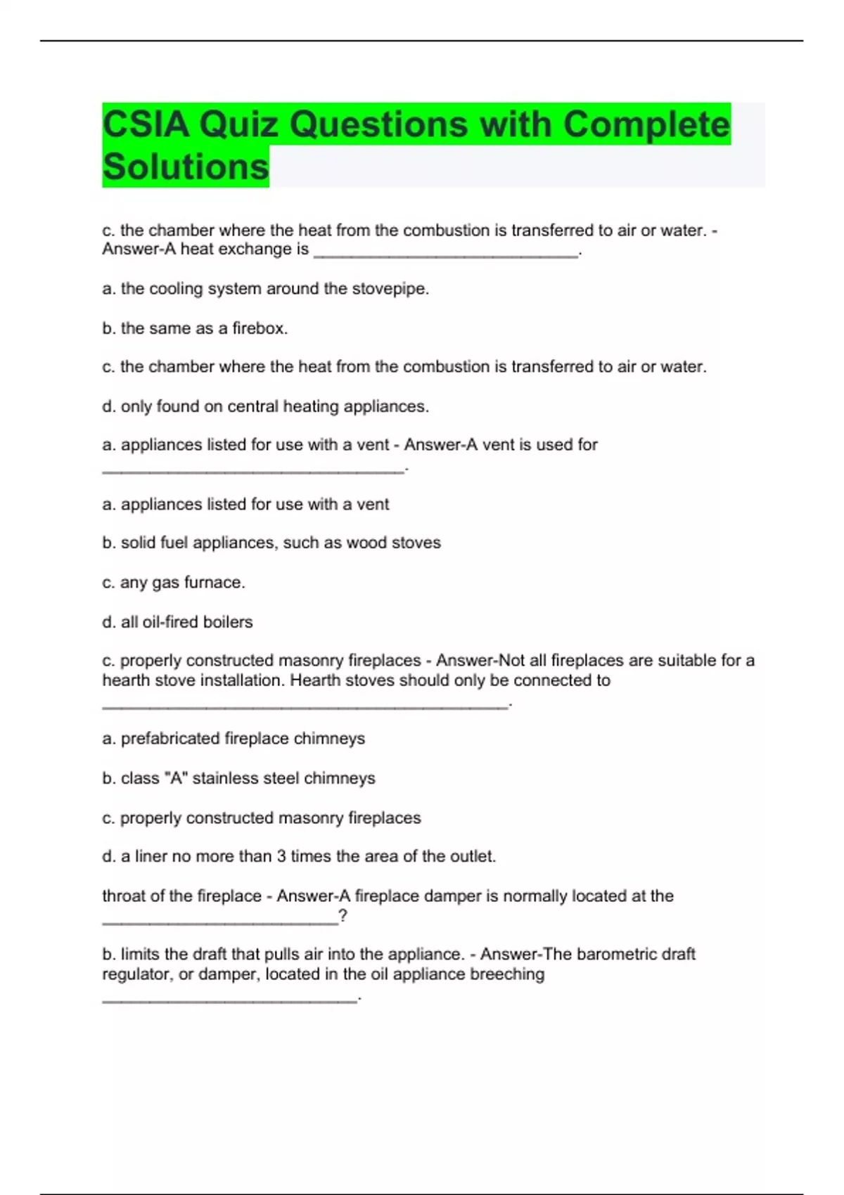 CSIA Quiz Questions with Complete Solutions H2O, heat and carbon dioxide - Answer-Absolute perfect combustion of wood fuel would have ___________________, _________________ and ______________ existing in the chimney. Pyrolysis - Answer-The chemical alteration of wood as a result of the application of heat is called? Carcinogen - Answer-Creosote is considered a ____________________, meaning that it is a know cancer causing material. Turbulence - Answer-_______________________ is caused by mortar joints projecting inside the flue area. It can create a more rapid build-up of creosote, reduce draft and slow the smoke. In the flue - Answer-Where is a heat reclaimed, also know as a heat extractor, located acidic - Answer-Creosote is ________________________ and should be removed from the venting system because it will corrode connections, steel and mortar.