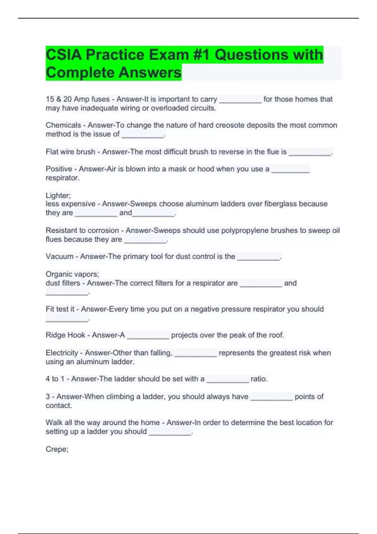CSIA Practice Exam #1 Questions with Complete Answers Level 2 - Answer-If you are inspecting a chimney you have been called to sweep and you find that it has no liner, what level of inspection should you recommend? __________ Gaps; cracks - Answer-What language would you include in your report of an unlined chimney? You should state that unlined chimneys are likely to have __________ and __________. Yes - Answer-While sweeping a wood stove you notice that your customer has a pull down access door to the attic. Would it be appropriate to access the attic during a level 1 inspection? YES or NO?