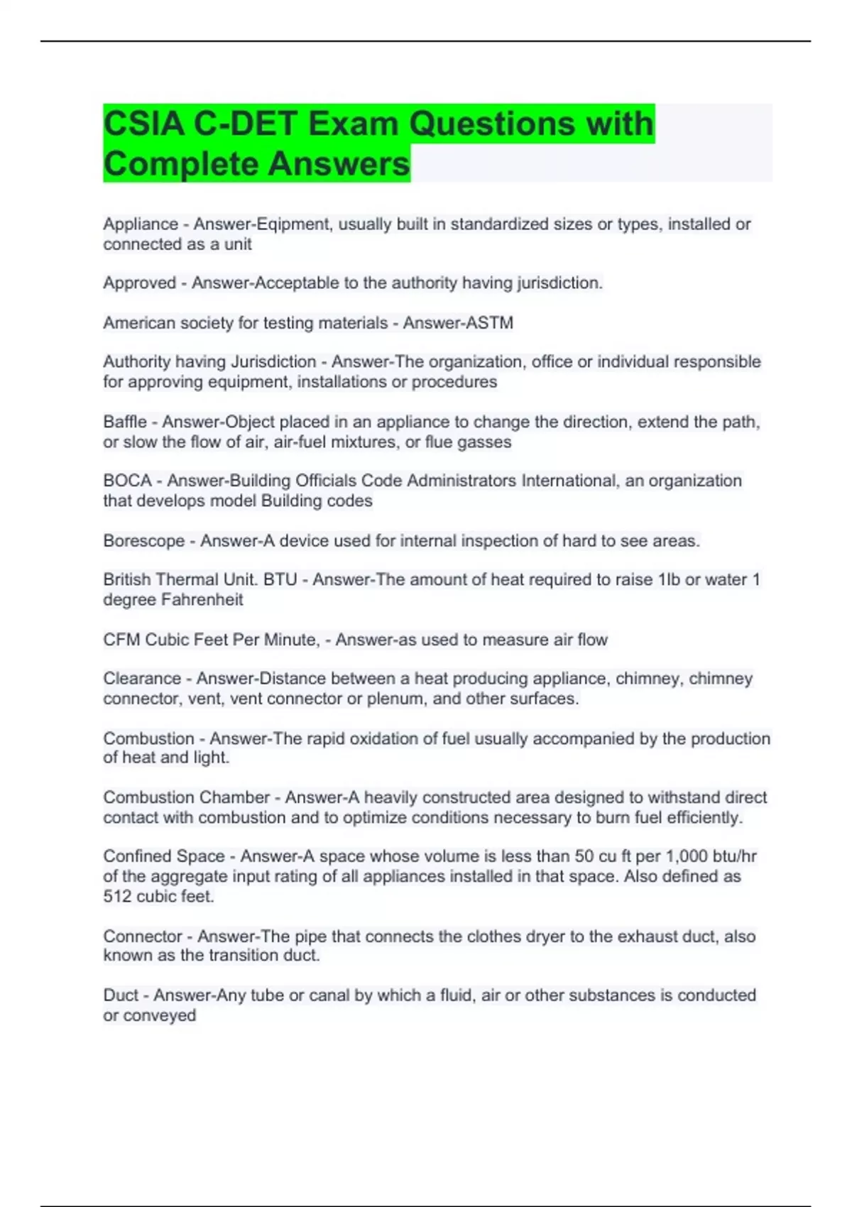 CSIA C-DET Exam Questions with Complete Answers Megnehelic gauge - Answer-Measures pressure differences Mechanical Draft - Answer-A draft produced by a fan or an air or steam jet Natural Draft - Answer-Draft produced by the difference on the weight of a column of flue gases in the chimney or vent and a corresponding column of air of equal dimension outside the chimney or vent NCSG - Answer-National Chimney Sweep Guild