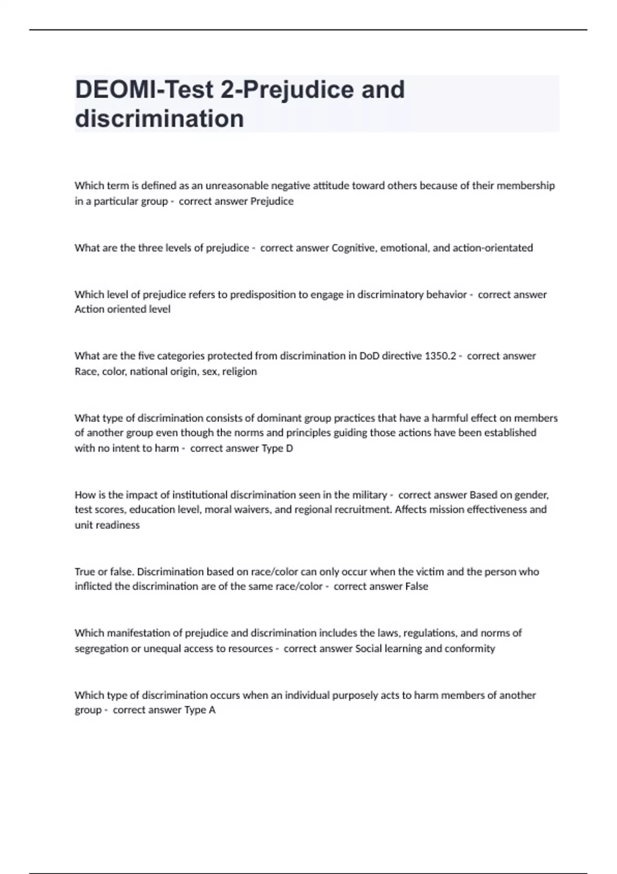 DEOMI-Test 2-Prejudice and discrimination questions well answered graded A+ 2024/2025